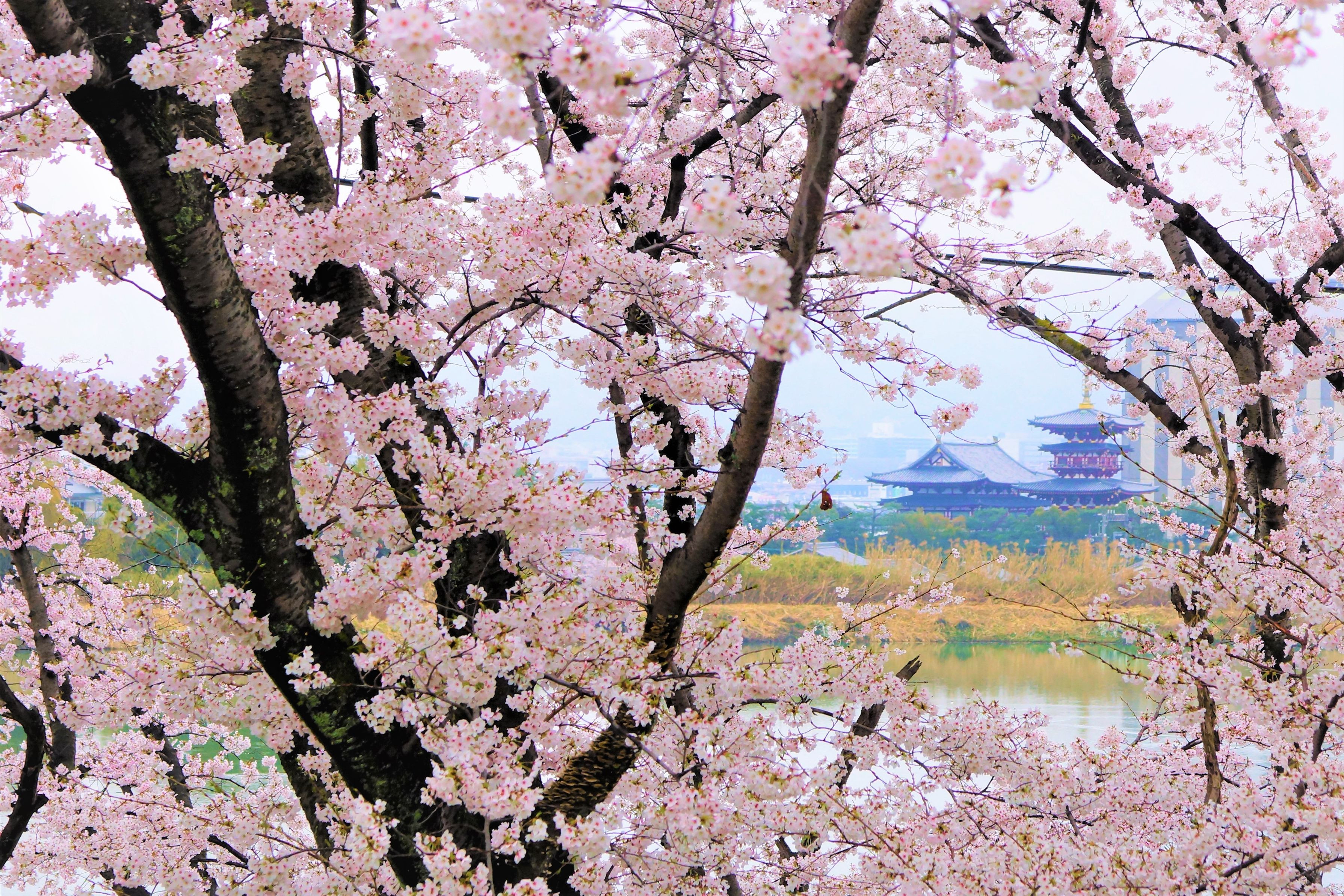 この場所からは、若草山を背景にして 東大寺の大屋根や、奈良県庁の姿も見る事が出来ます。 ちなみに薬師寺東塔は現在、解体修理が行われています。