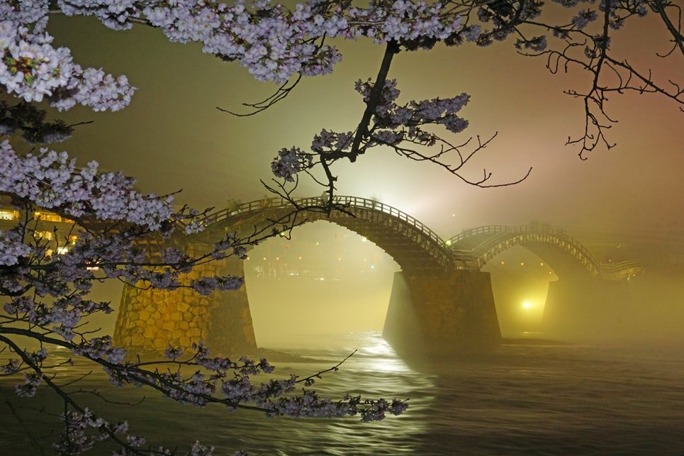 山口県・岩国市の錦帯橋の桜が満開になっていました。満開の桜に加えて、川に 霧が濃くかかっていて、今までにない夜桜を堪能しました🌸