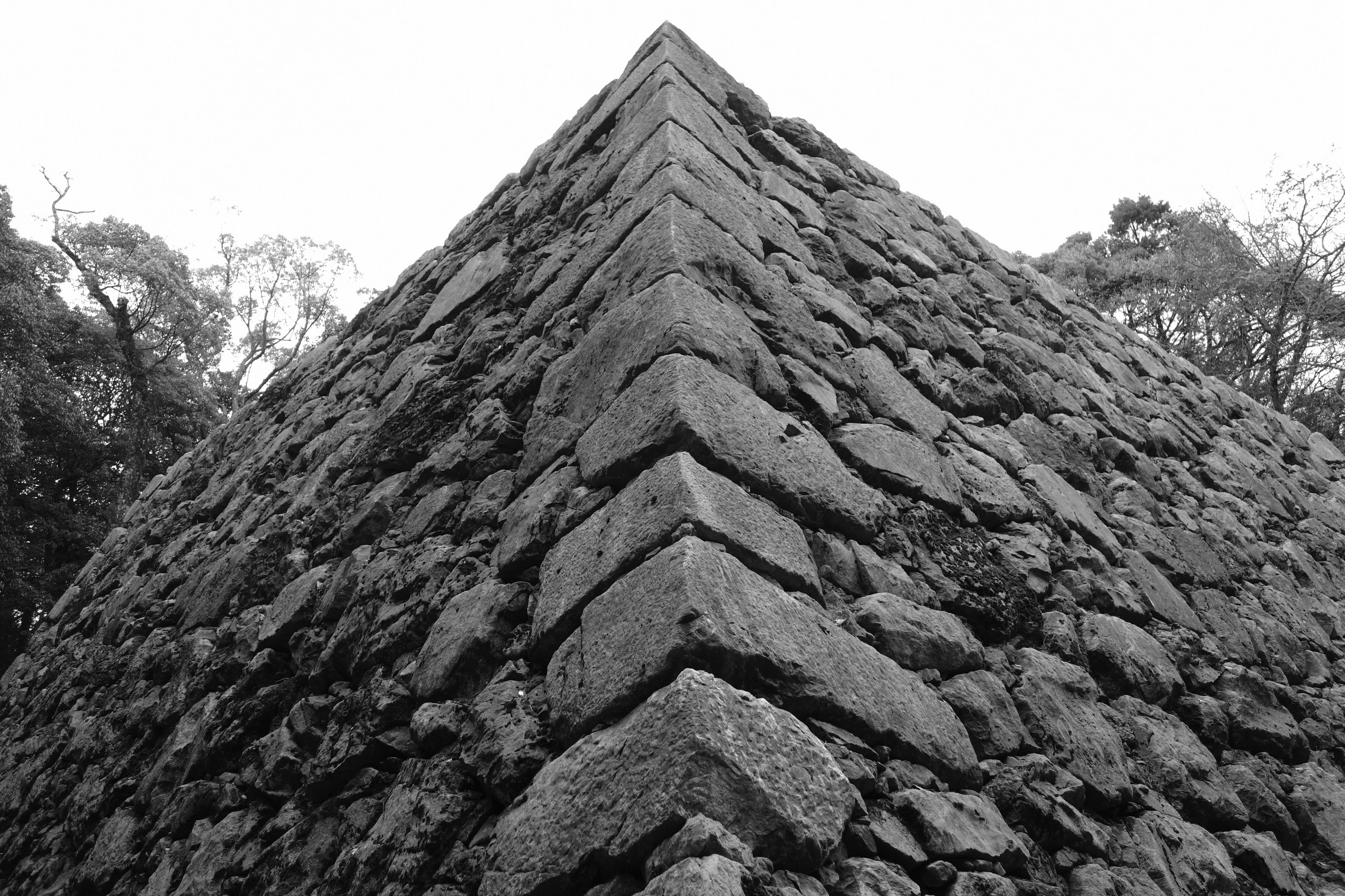 天守台の石垣がピラミッドのように力強く見えました。 曇り空でモノトーンなのでいっそのことモノクロで撮りました。 岩国城旧天守台にて。