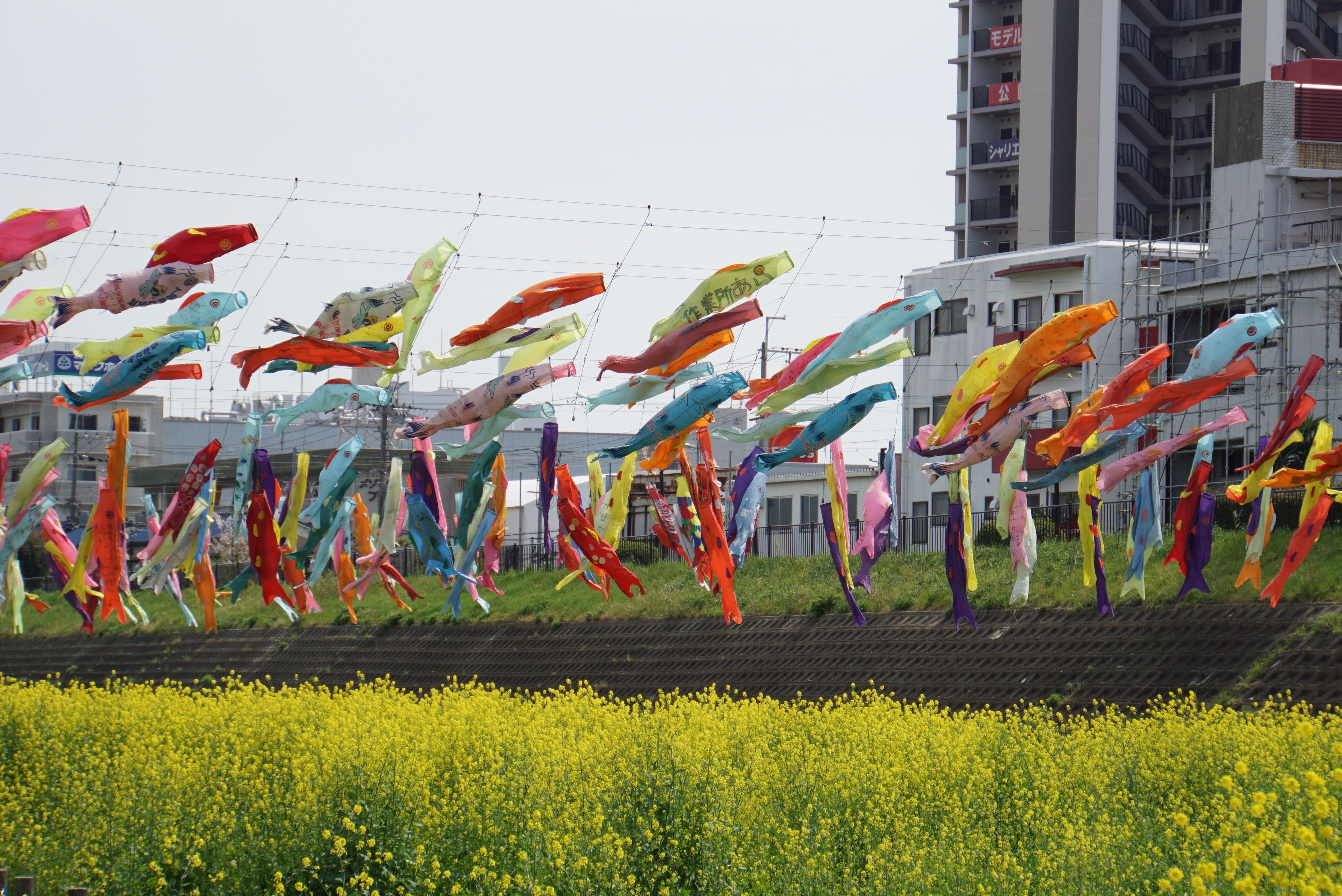 河川敷ないに咲いている菜の花とこいのぼりのコラボレーションを撮影して見ました。