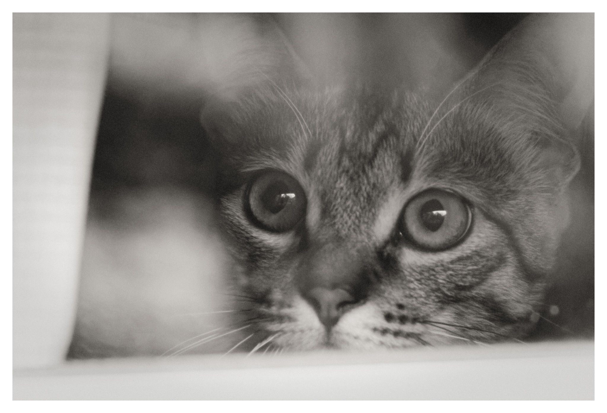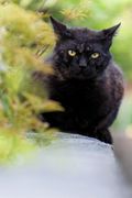 カーテンの隙間からサラさんが庭を警戒しています。 視線の先には黒猫さんがこちらを見ていました。