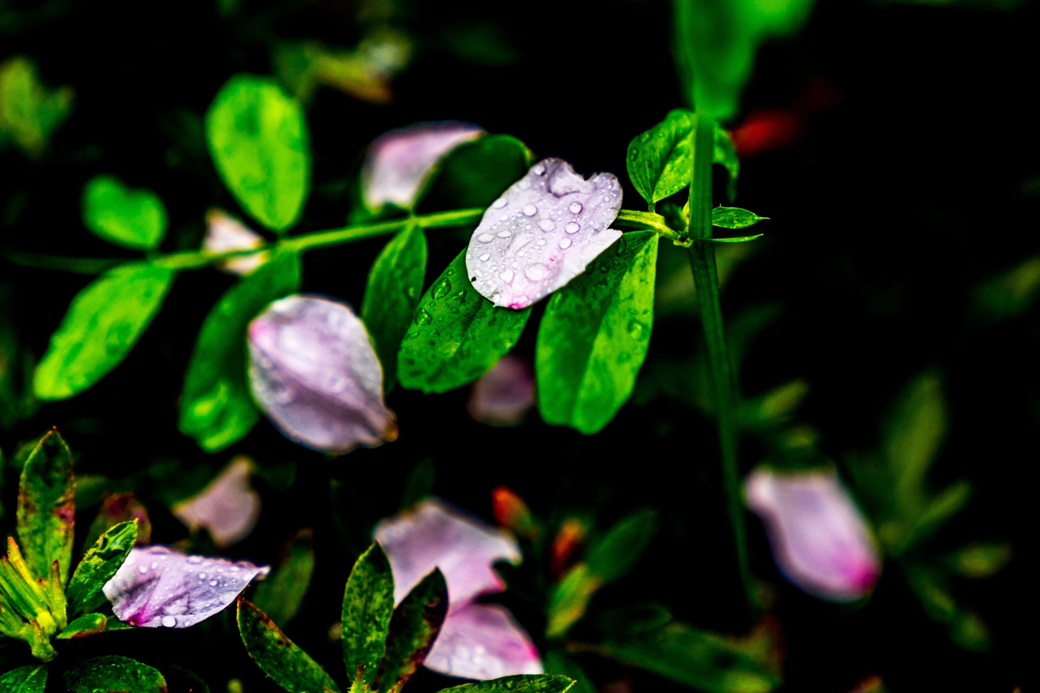 雨にで散った桜の花びらは寂しそう。 夜桜で散った花びらにストロボを使って撮影しました。 若葉の方が目立ちますね。。。