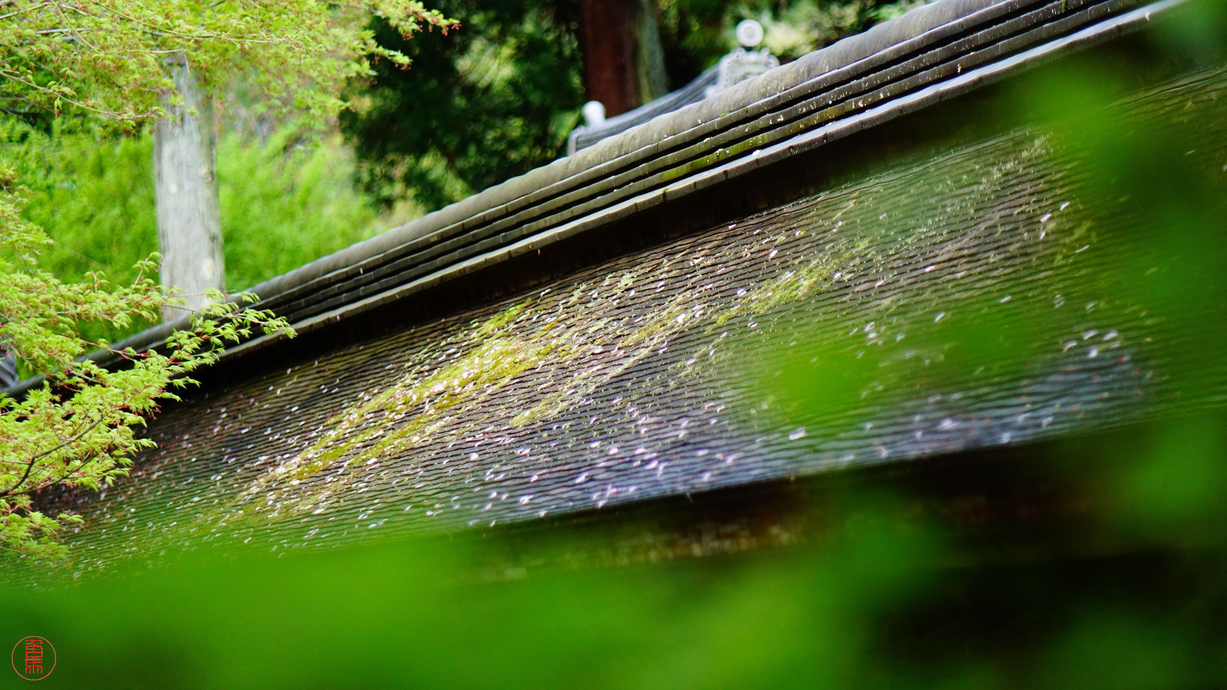 散り頃に春の嵐の強風で コケラ屋根にあまり積もらず散る桜 理想の散り姿を見るために、また来年。