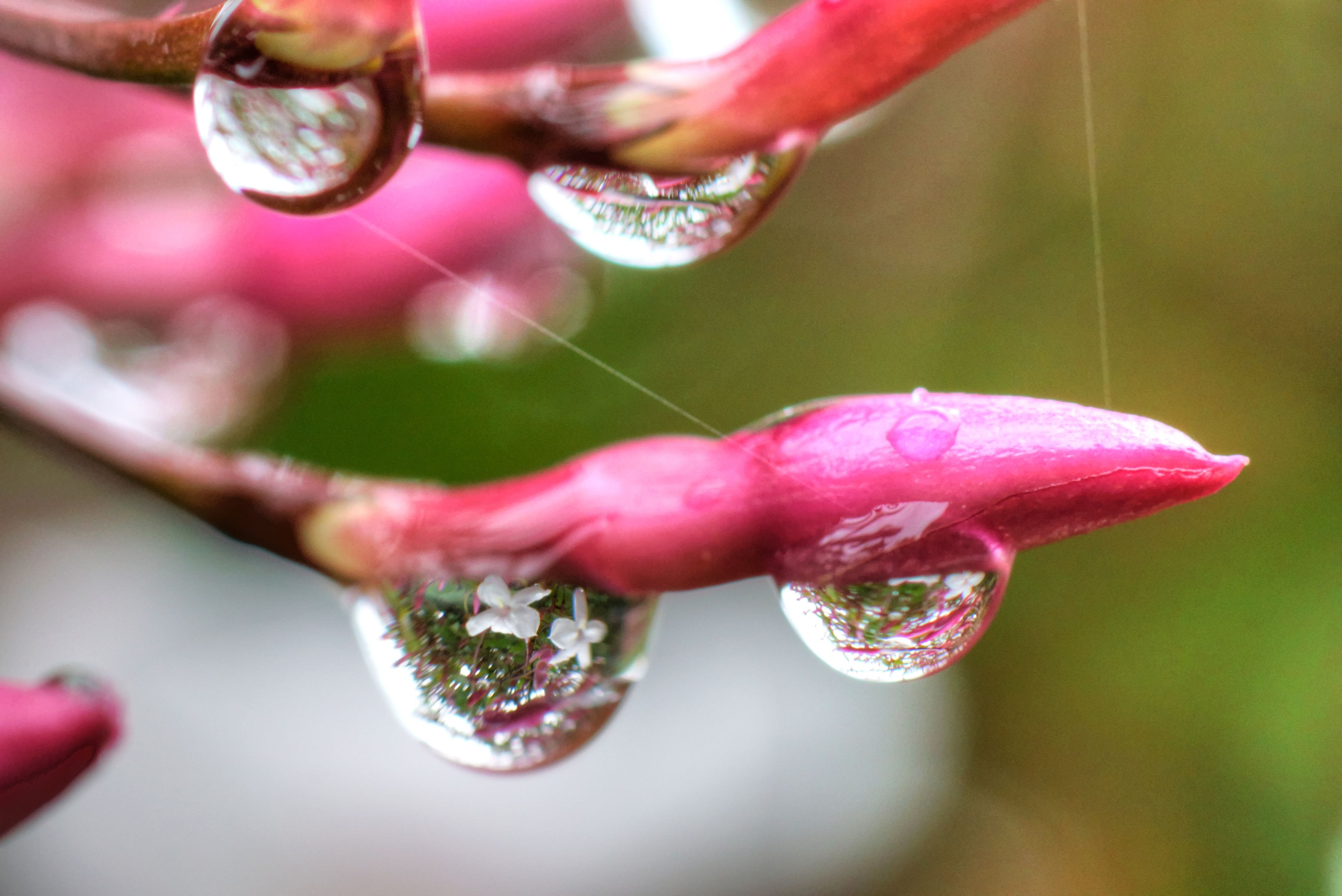 雨上がり、ジャスミンのつぼみに付いた滴に写りこんだ花がまるでガラス細工のようでした。