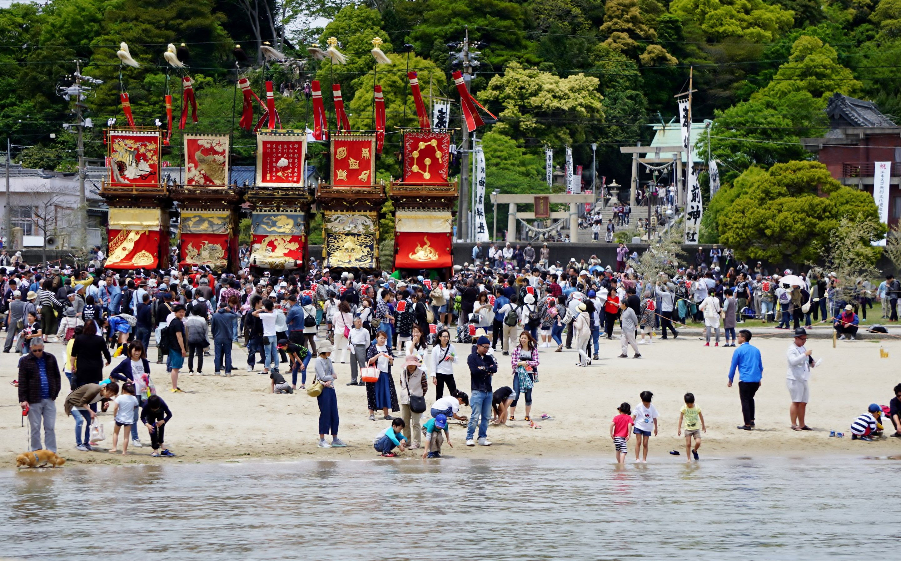 亀崎潮干祭の5台の山車と海辺で遊んでいる子供たちと子供の神様の神社の写真です。