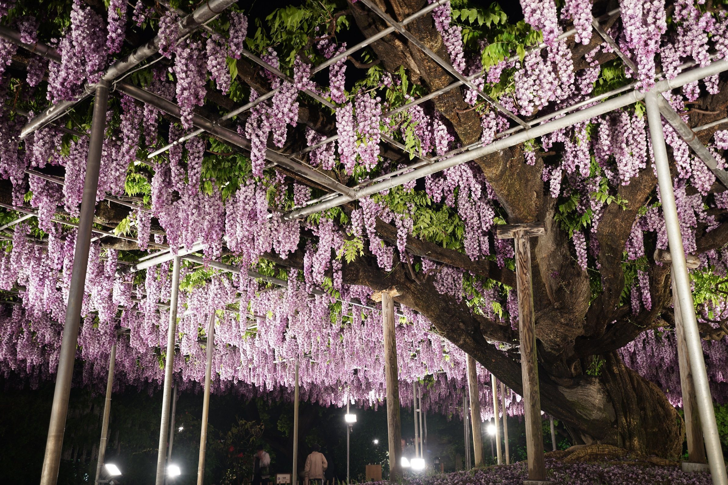 あしかがフラワーパークの大藤 今年は、スコール後の撮影で昨年のと比べると幹が湿って暗くなってしまっている。