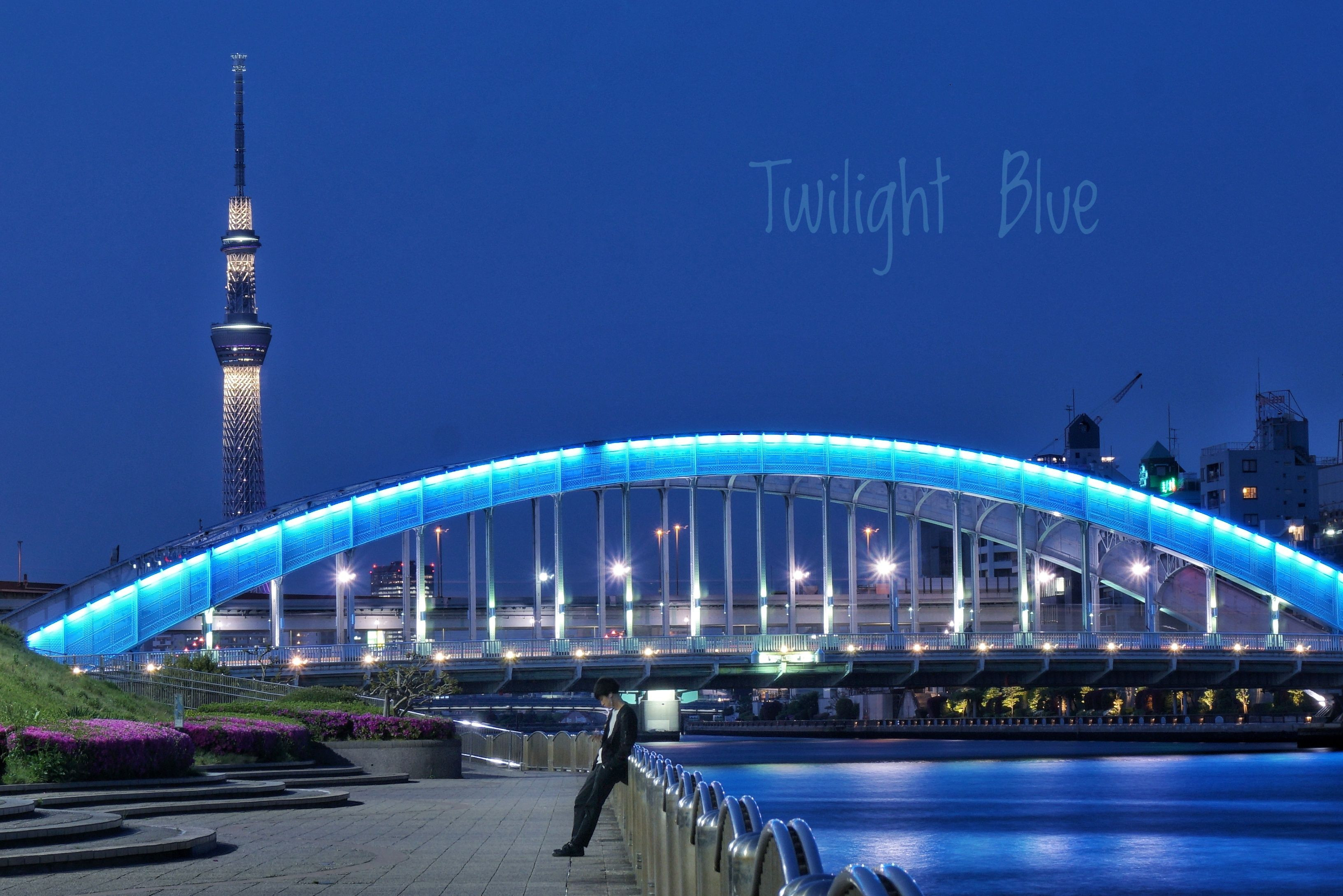 夜の帳が降り始めブルーに彩られた橋が輝く頃、何を想うか男はひとり黄昏る・・ 川面に吹き抜ける5月の風を肌に感じながら・・・ 暮れなずむ永代橋を背景に偶然出会ったヒトコマを長秒で切り取ってみました