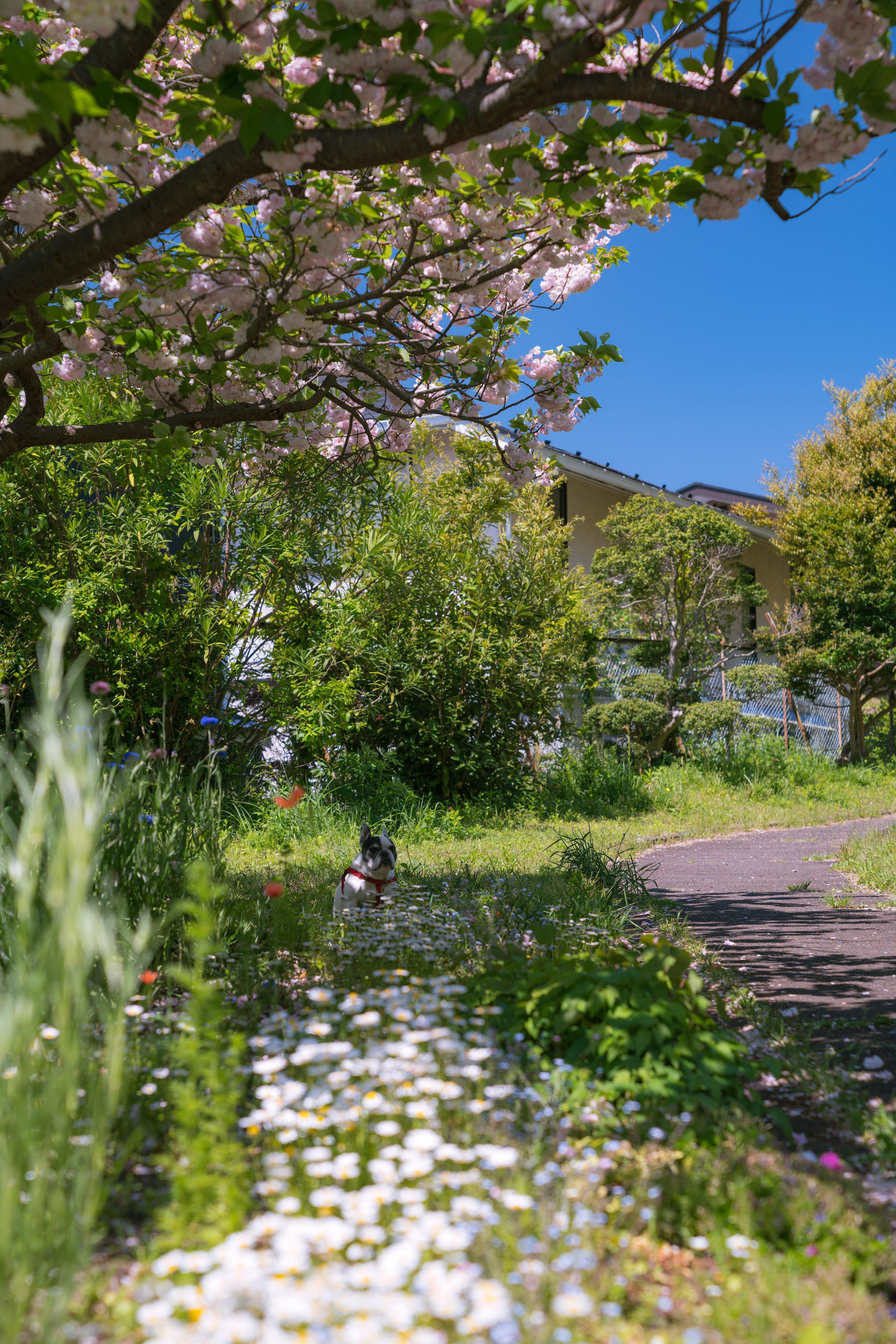 花々の先に愛犬のフレブル! 春の陽気に包まれた彼女を 撮りました。