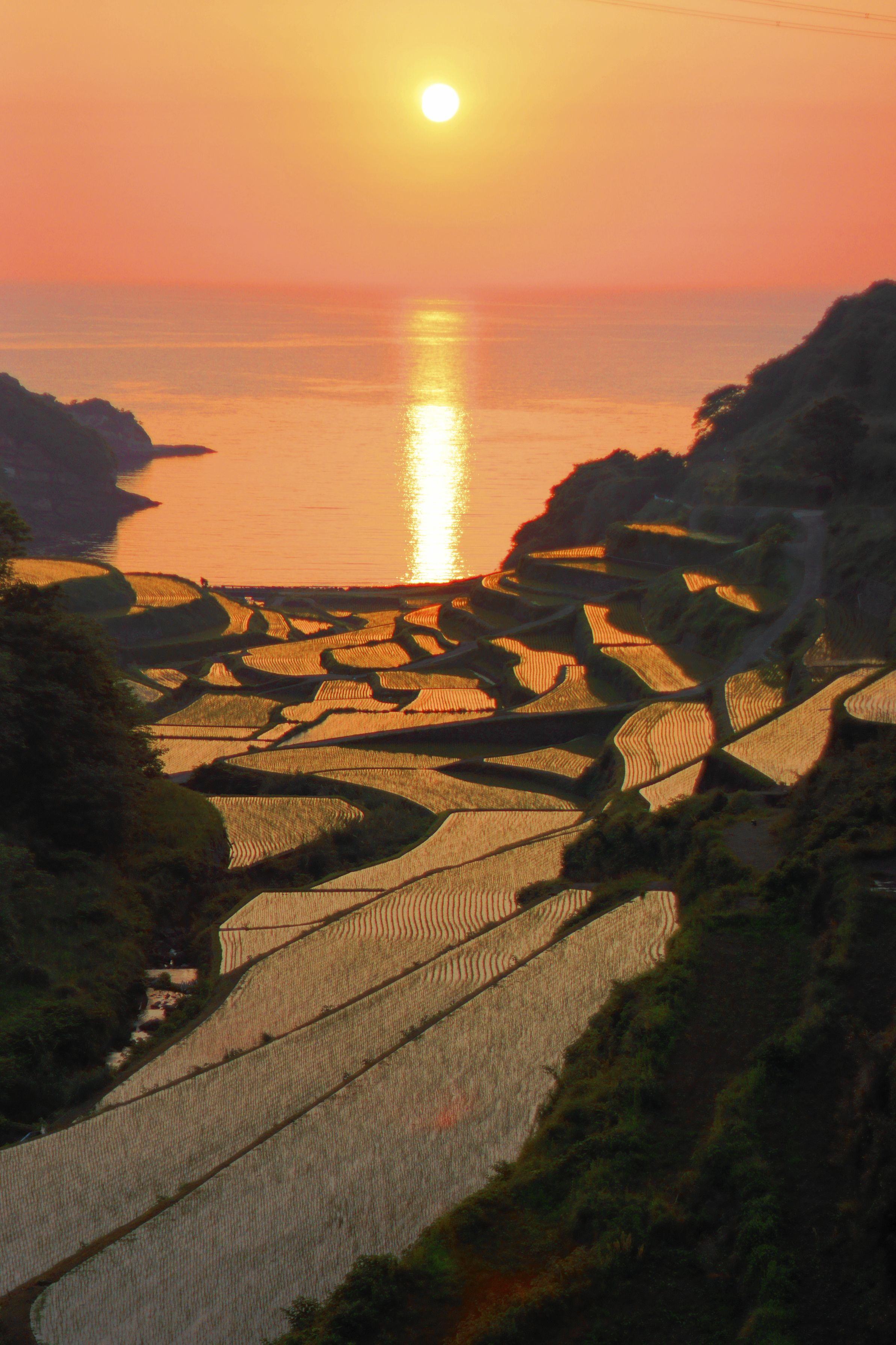 久しぶりに相棒にまたがり 夕陽を追いかけてここまで来ました。 田植えが終わった棚田に...。 オレンジが反射しました。