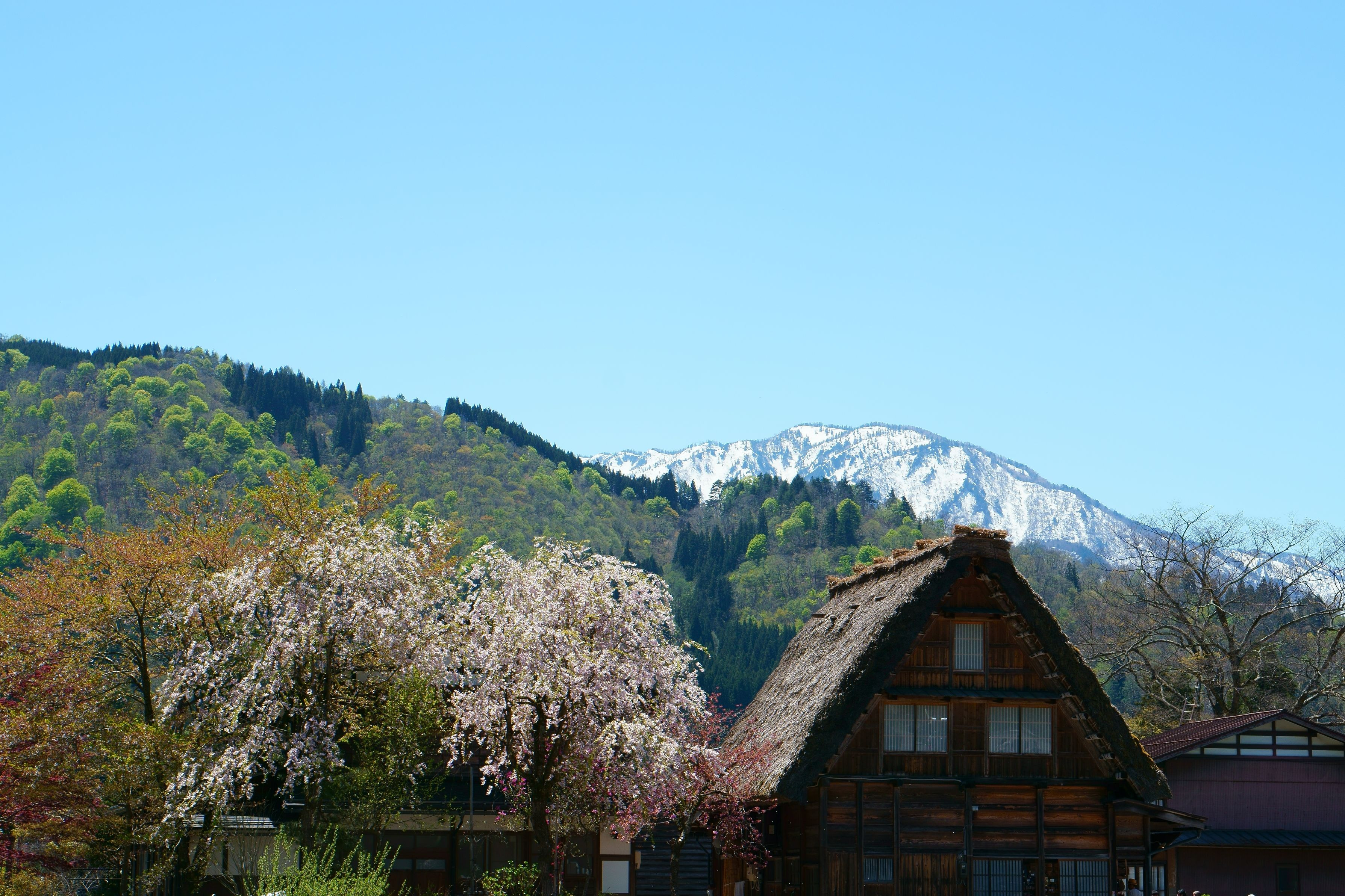 GWに行った白川郷の風景 桜と雪山の季節のミスマッチ感が素晴らしかったです