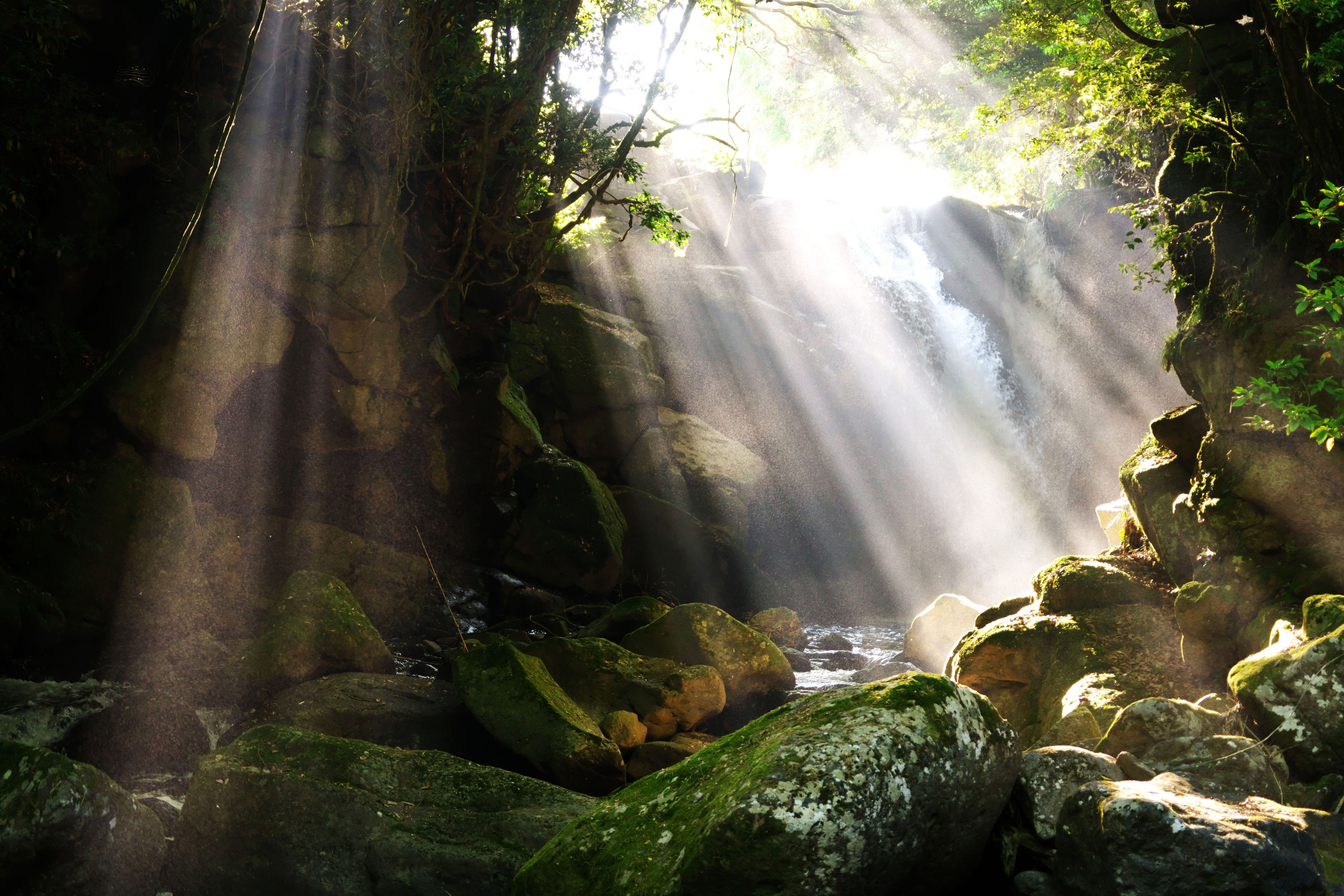 朝日差しが高くなると光芒は末広がり、朝の晴天で見られた。