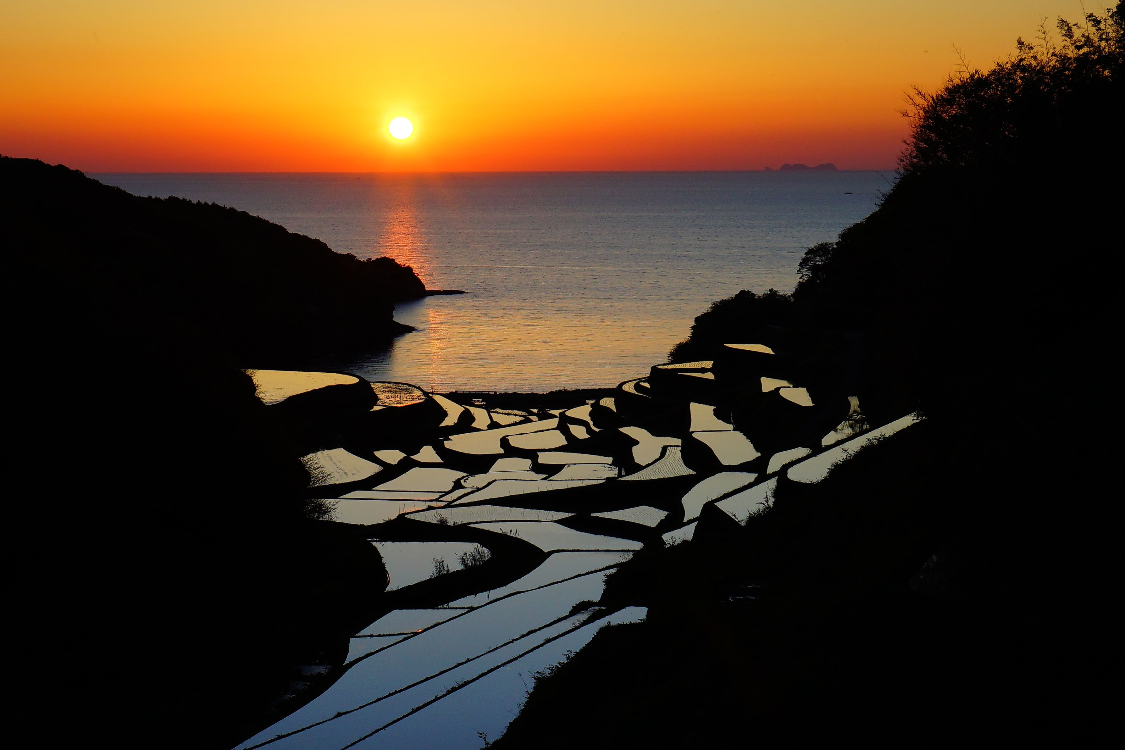 戸崎の岬で途絶えそうな光の筋・・ 何とか棚田まで届きました。