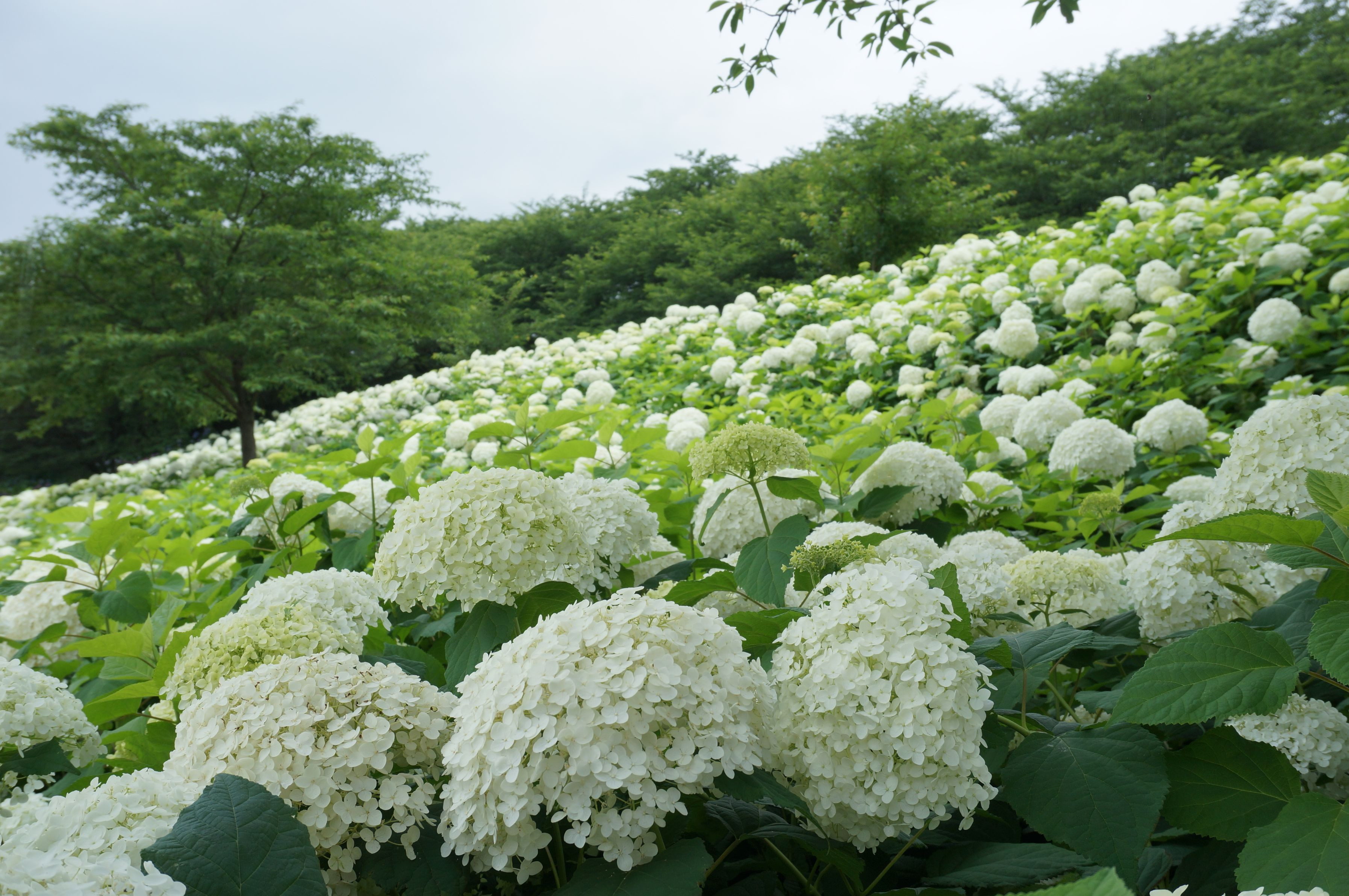 2年前から更新が止まっていましたが、ぼちぼちと投稿を再開しました。 権現堂公園の紫陽花(2年前のもの)です。 着いてすぐ、斜面いっぱいに咲き誇る白い紫陽花に迎えられました。驚きました。見事でした!