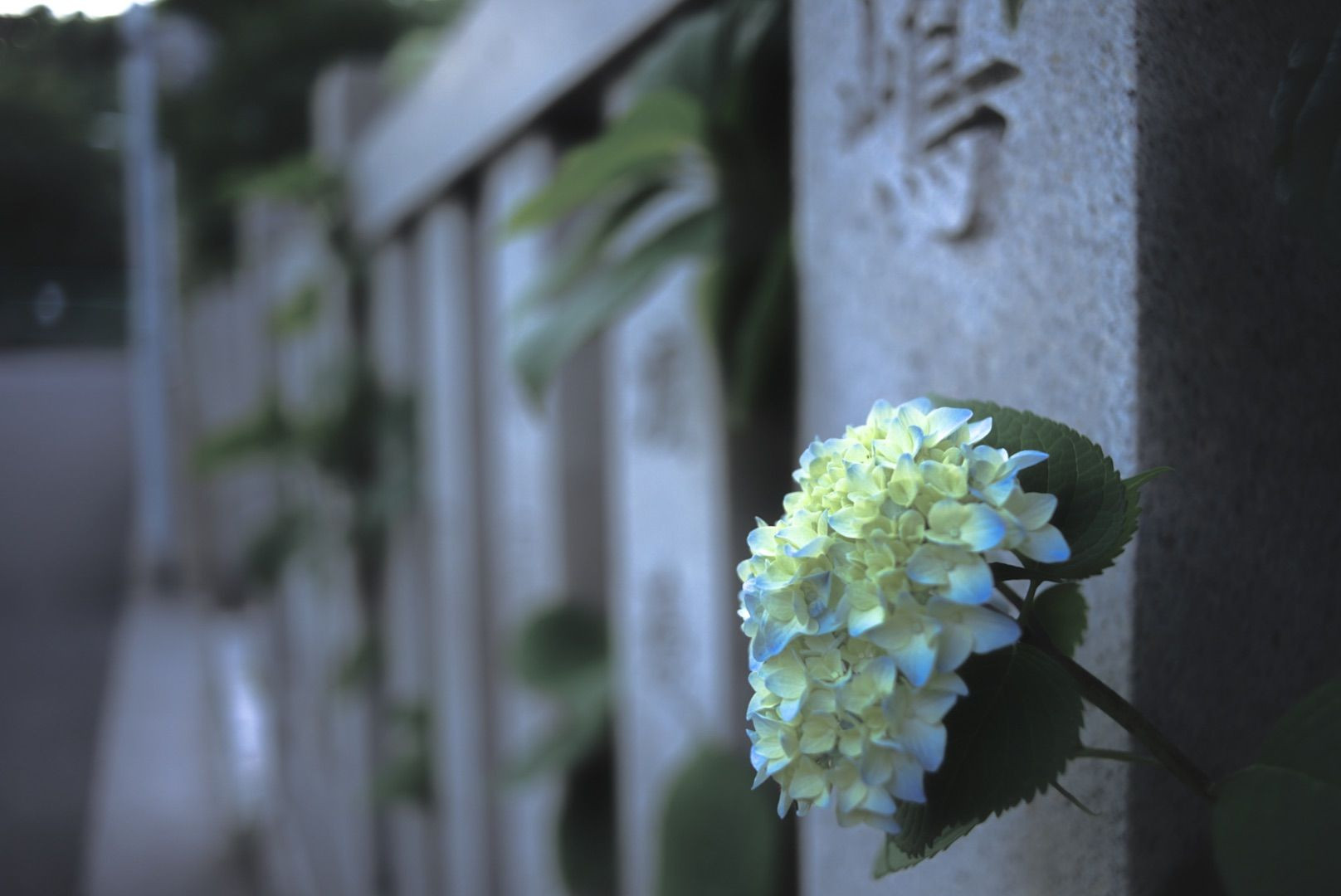 梅雨前の夕方、神社から少しだけ紫陽花が覗かせてます。