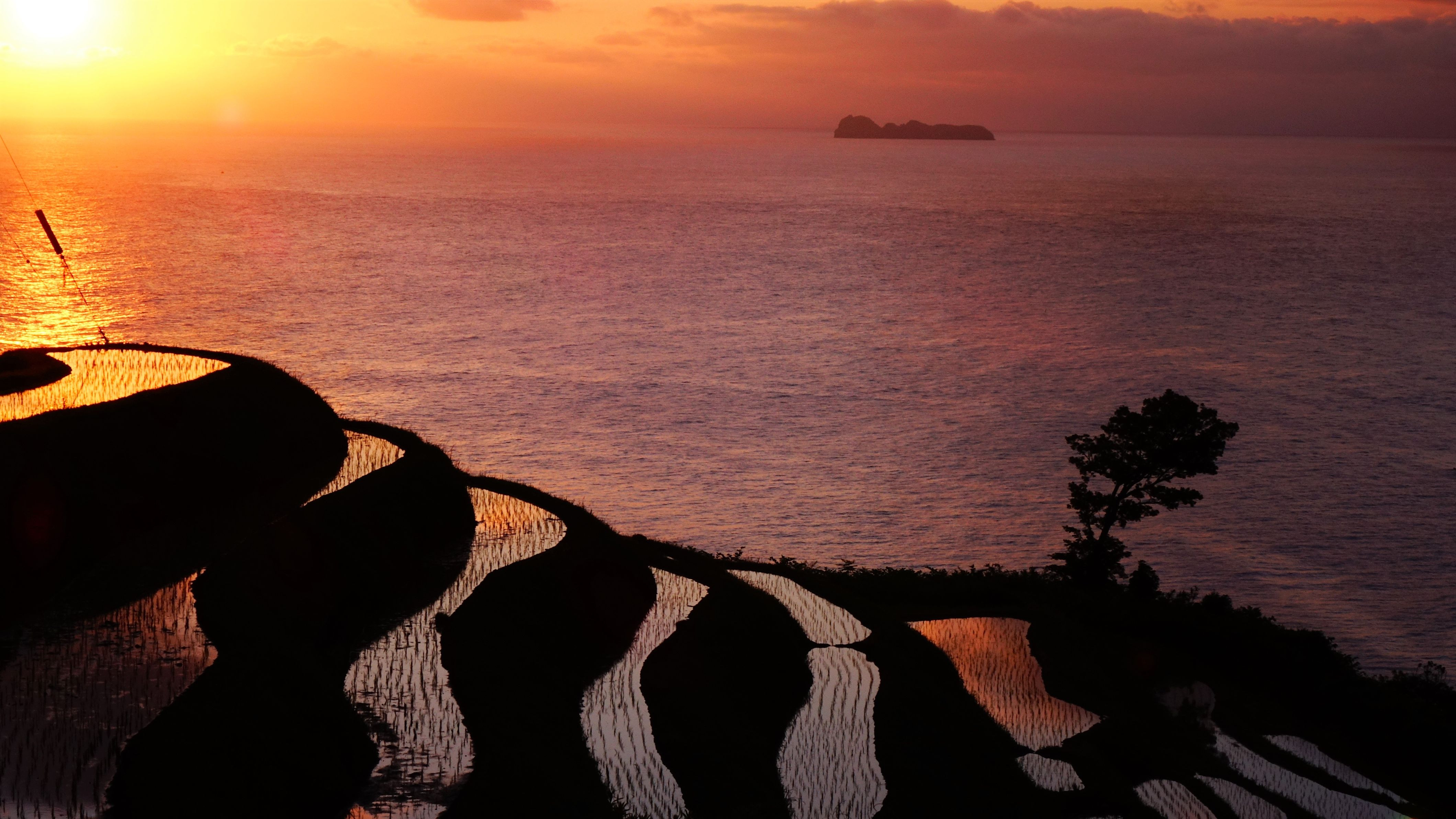 丹後半島 東岸 日本海に昇る朝陽を受けて輝く棚田。