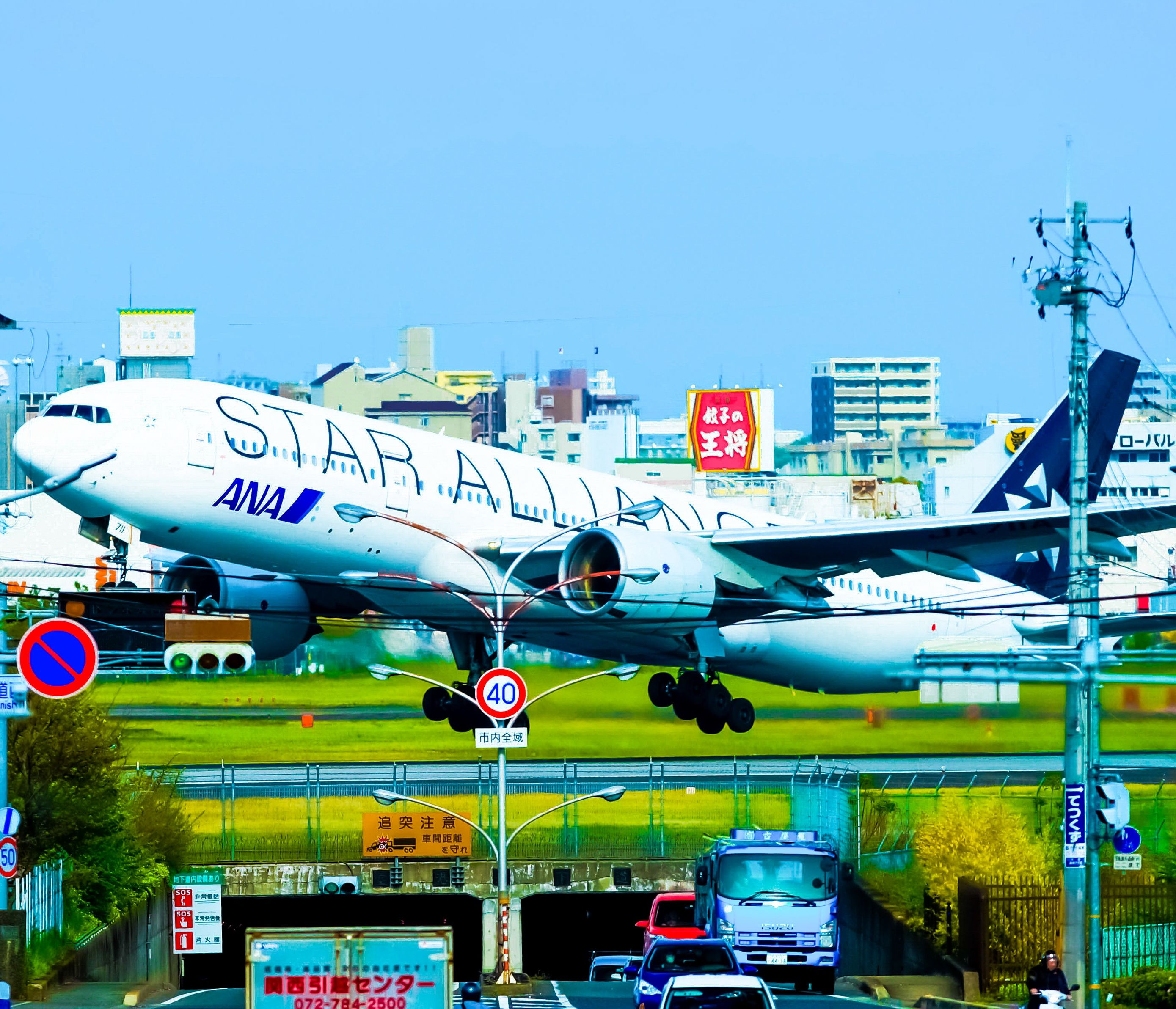 伊丹空港の離陸シーンです。車と飛行機の対象が面白いデス。