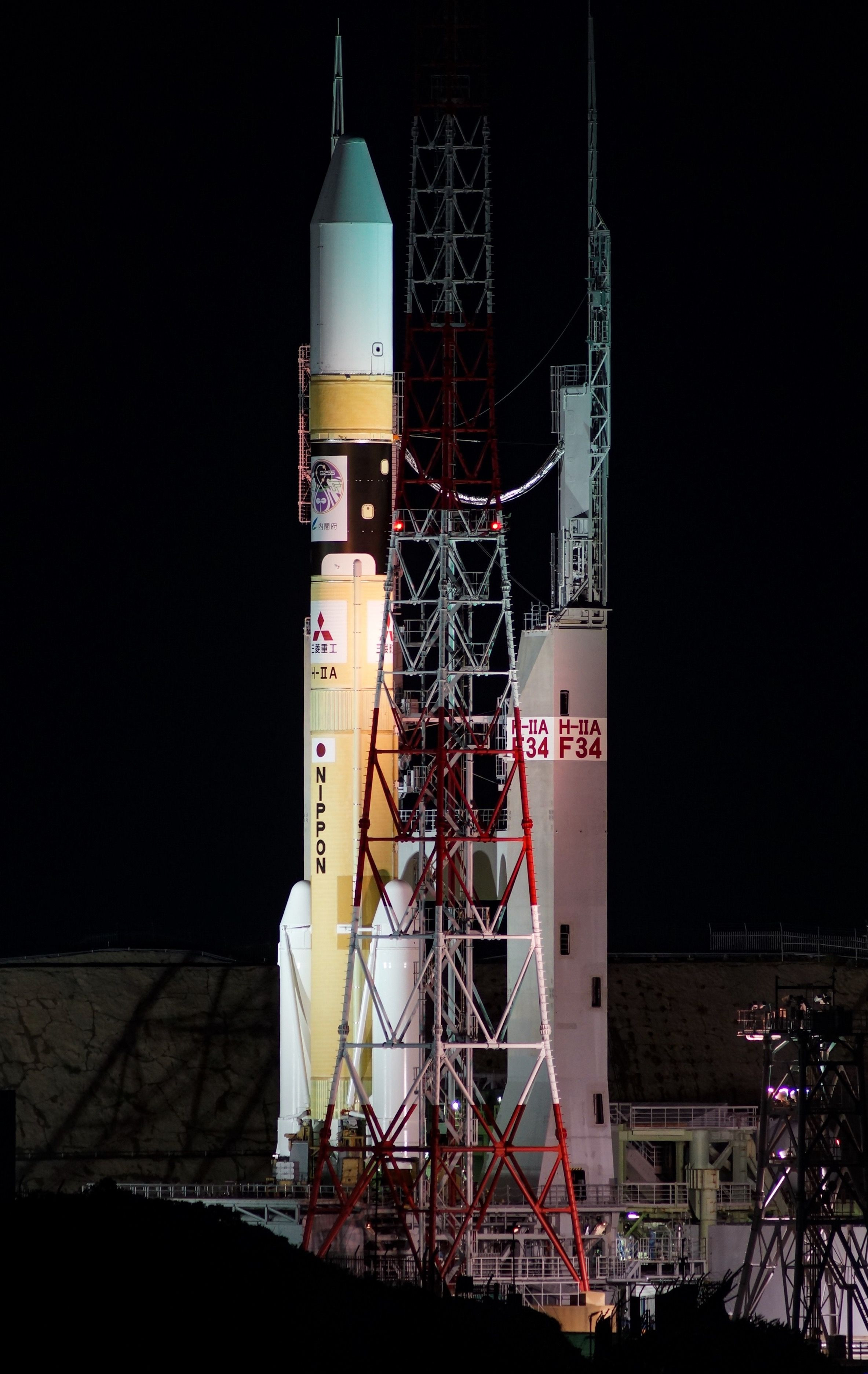 射点へ移動したH-2Aロケット34号機 ミッションロゴのデザインはエヴァンゲリオンのカラー