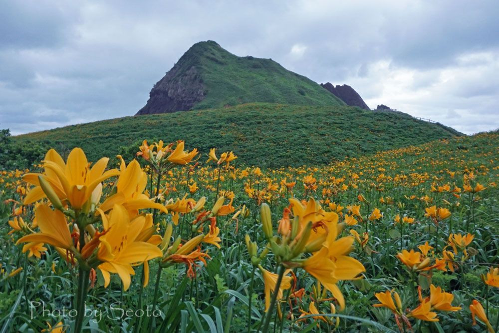海に突き出た佐渡の景勝地 大野亀 トビシマカンゾウが満開です(天気がイマイチ・・・汗)