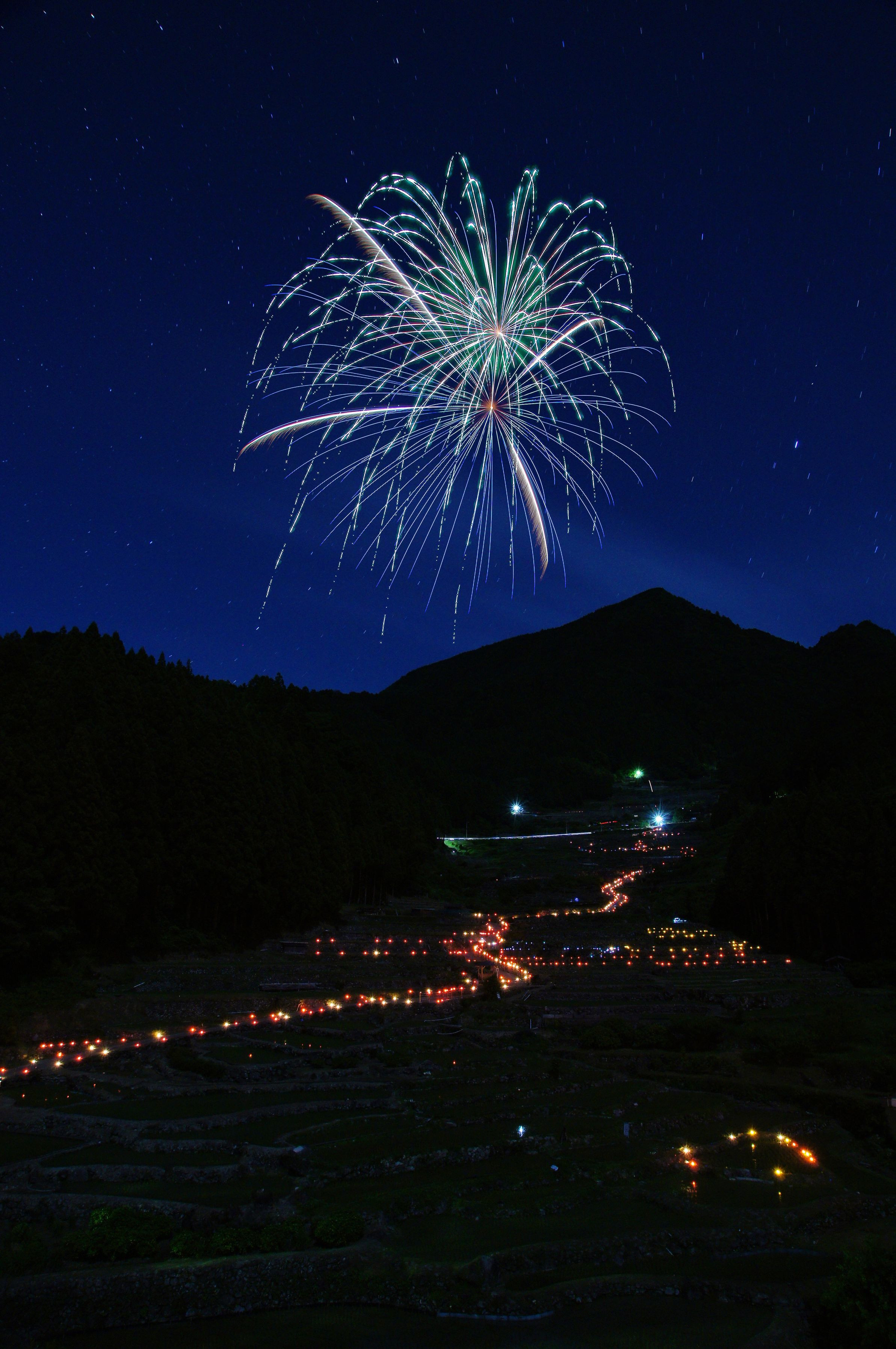 新城市 四谷の千枚田 ロウソクと花火のイベントです 比較明合成してます