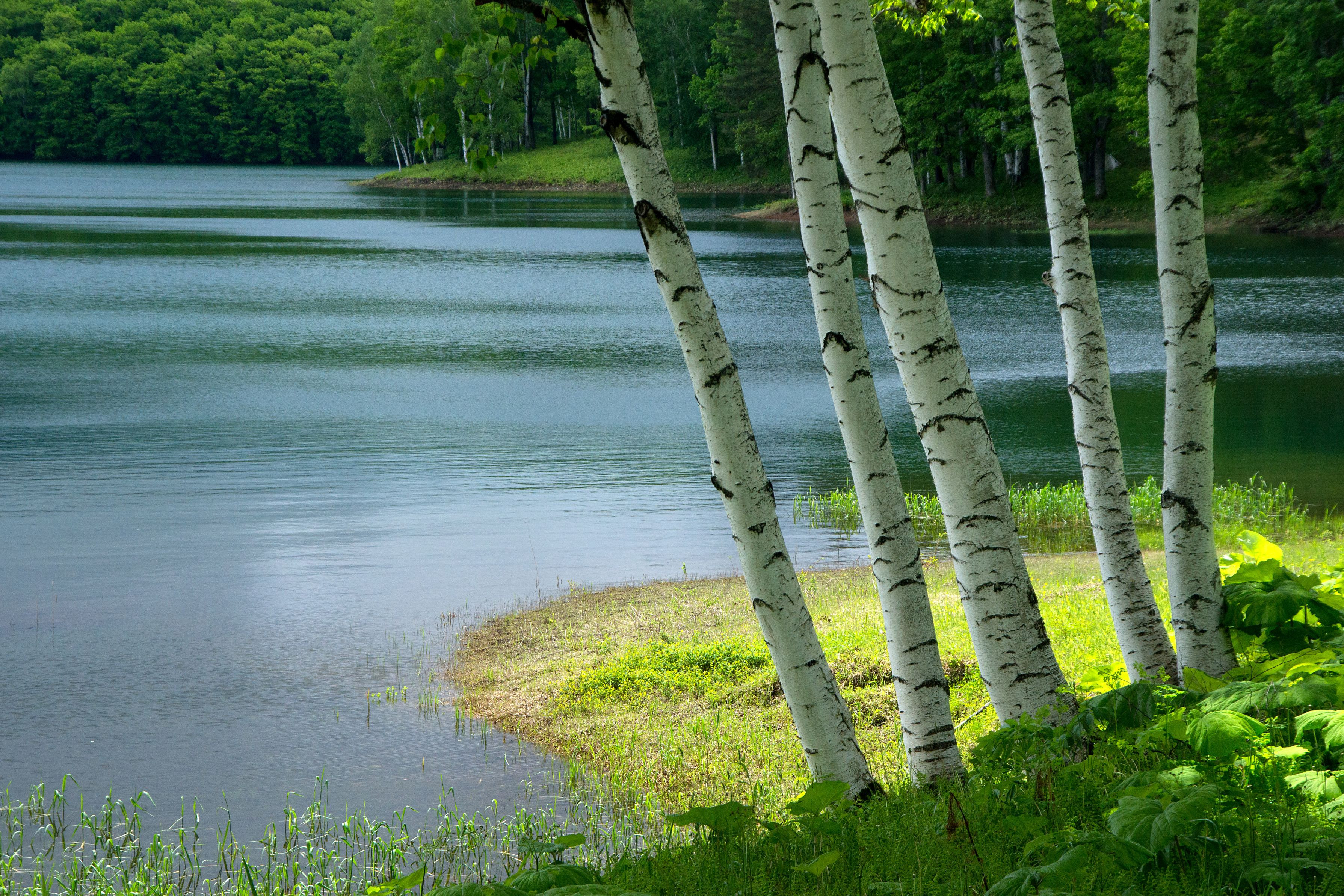 白樺の白と湖面の紋様に魅せられて、シャッターを切りました。 、