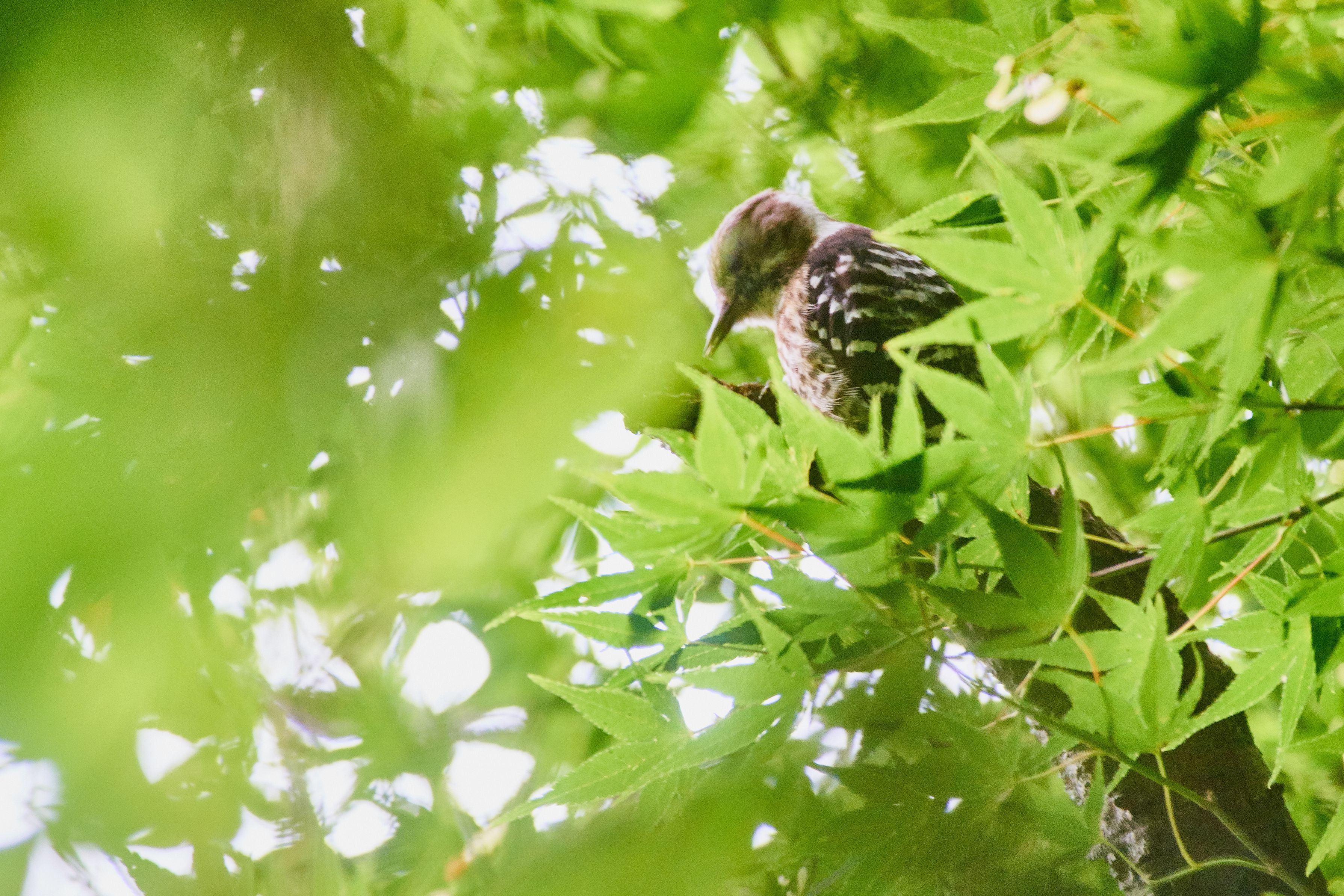 コンコンいってるところに近づくと、キツツキ(コゲラ)に初遭遇しました(^^♪ コゲラはキツツキの中でもよく見かける方みたいですね。 ちょっと顔がぶれぎみ(・。・;