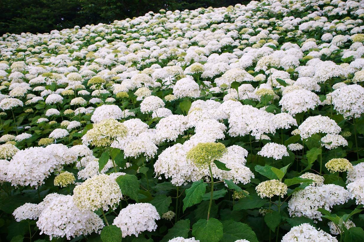 斜面を白く覆うアナベルの群生。梅雨のじめじめ感を払拭してくれるかのよう。おっと,雨が降り始めた。やはりアジサイには雨がよく似合う。