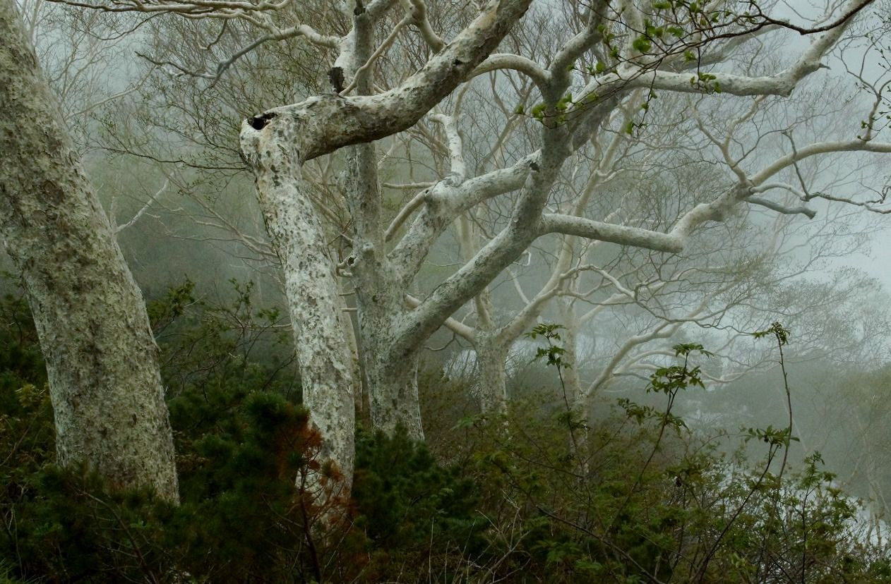 八方池を少し上がったところに綺麗に並ぶダケカンバ。 霧が漂う幻想的な光景に感動しました。