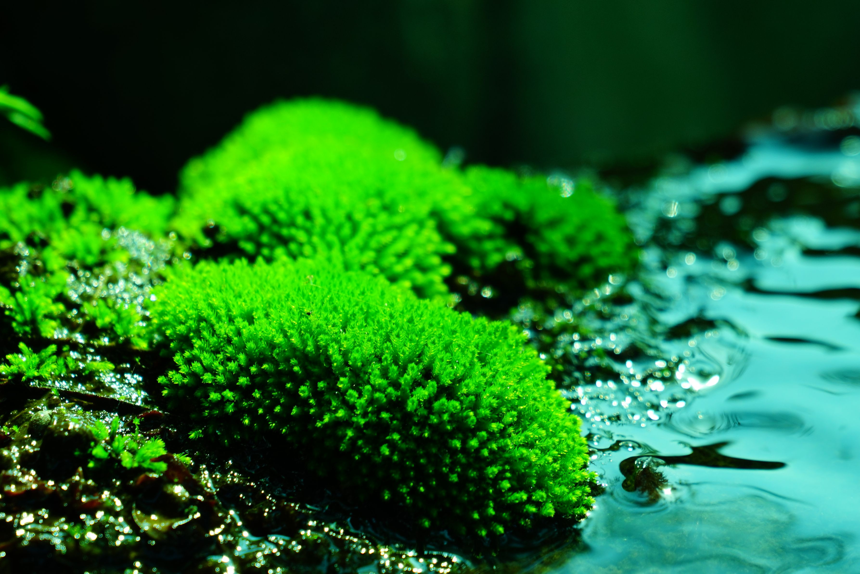 木漏れ日の当たる、水路の脇に、緑の色…。どこの環境にも、生きている植物。