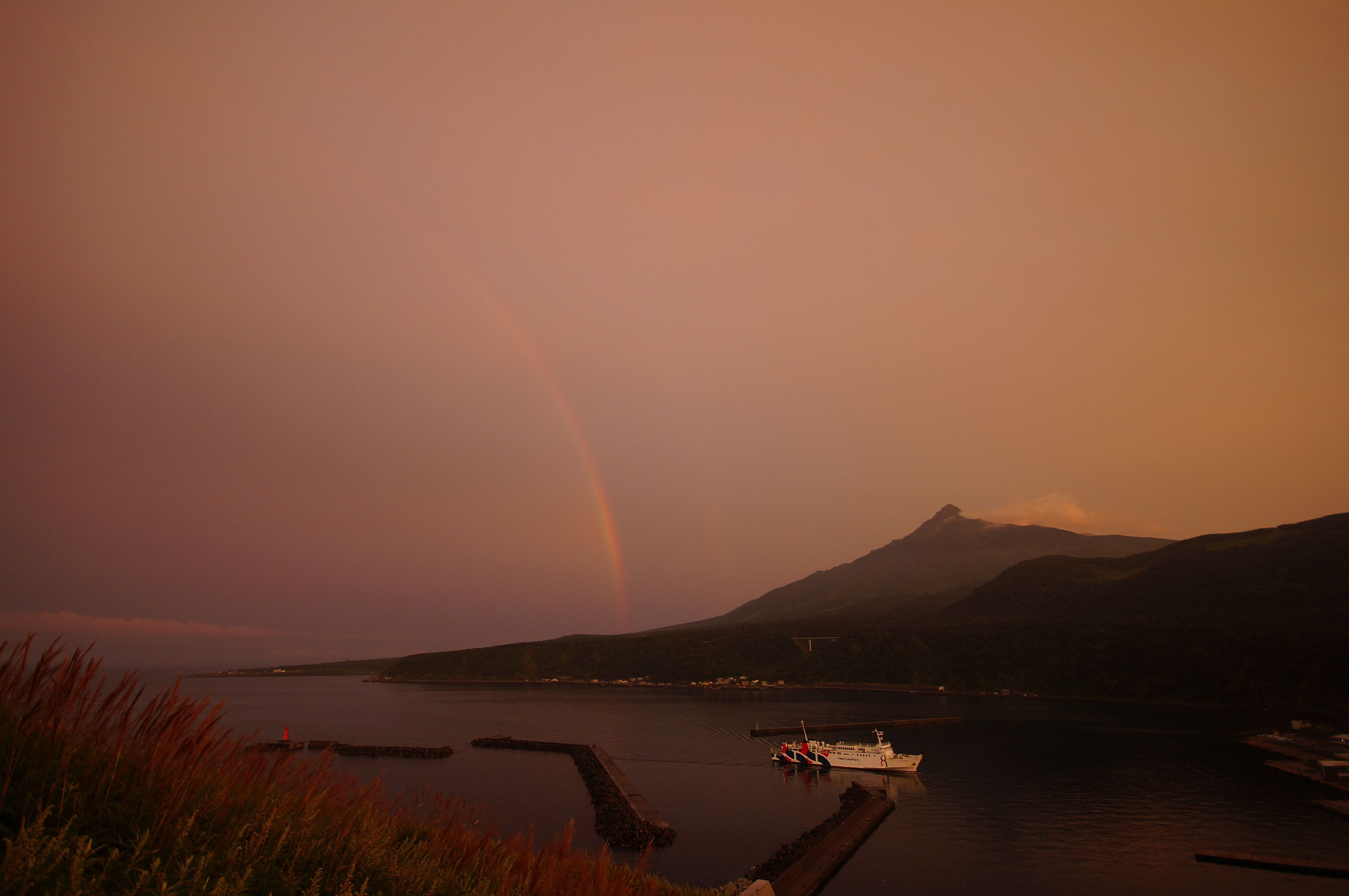 ホテルの裏がペシ岬でした。一歳の娘を妻と交代でおんぶして登ったら、夕日に照らされた利尻富士と虹が現れました。 礼文島から帰ってきたフェリーも一緒に。