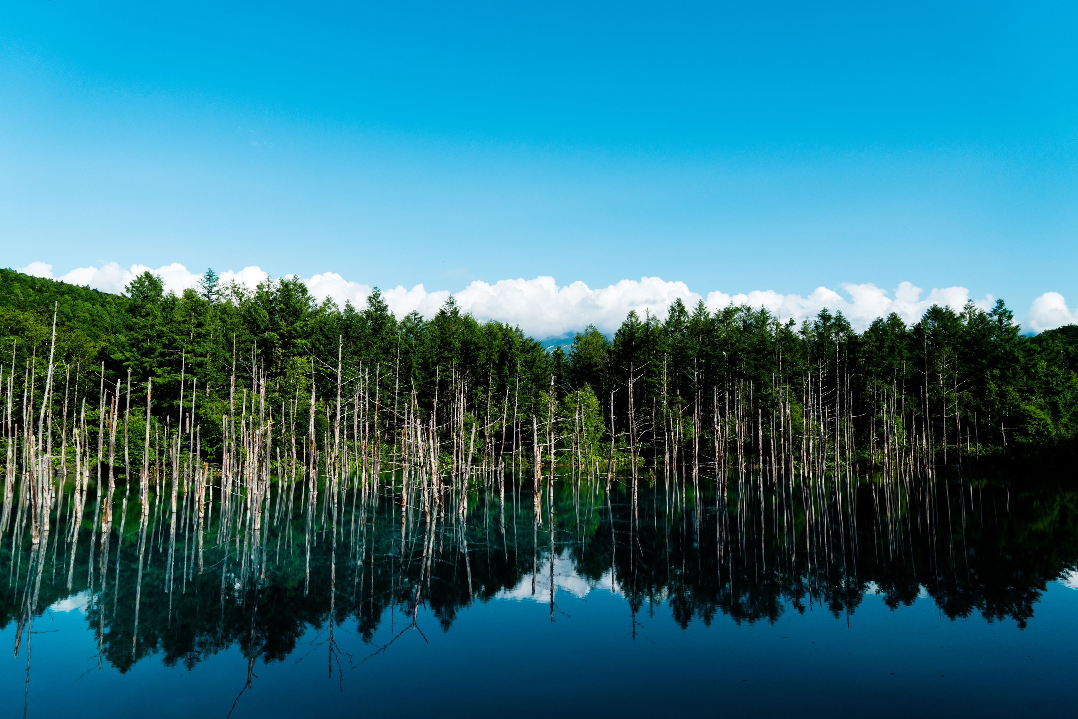 初めての北海道旅行中。 話題の撮影スポット、青い池にて。 空も池も一面青に染まってました。 ---- 現像にとらいでんと+氏 ( https://twitter.com/tridentplus )作のVelvia50風カメラプロファイルを使用しています。