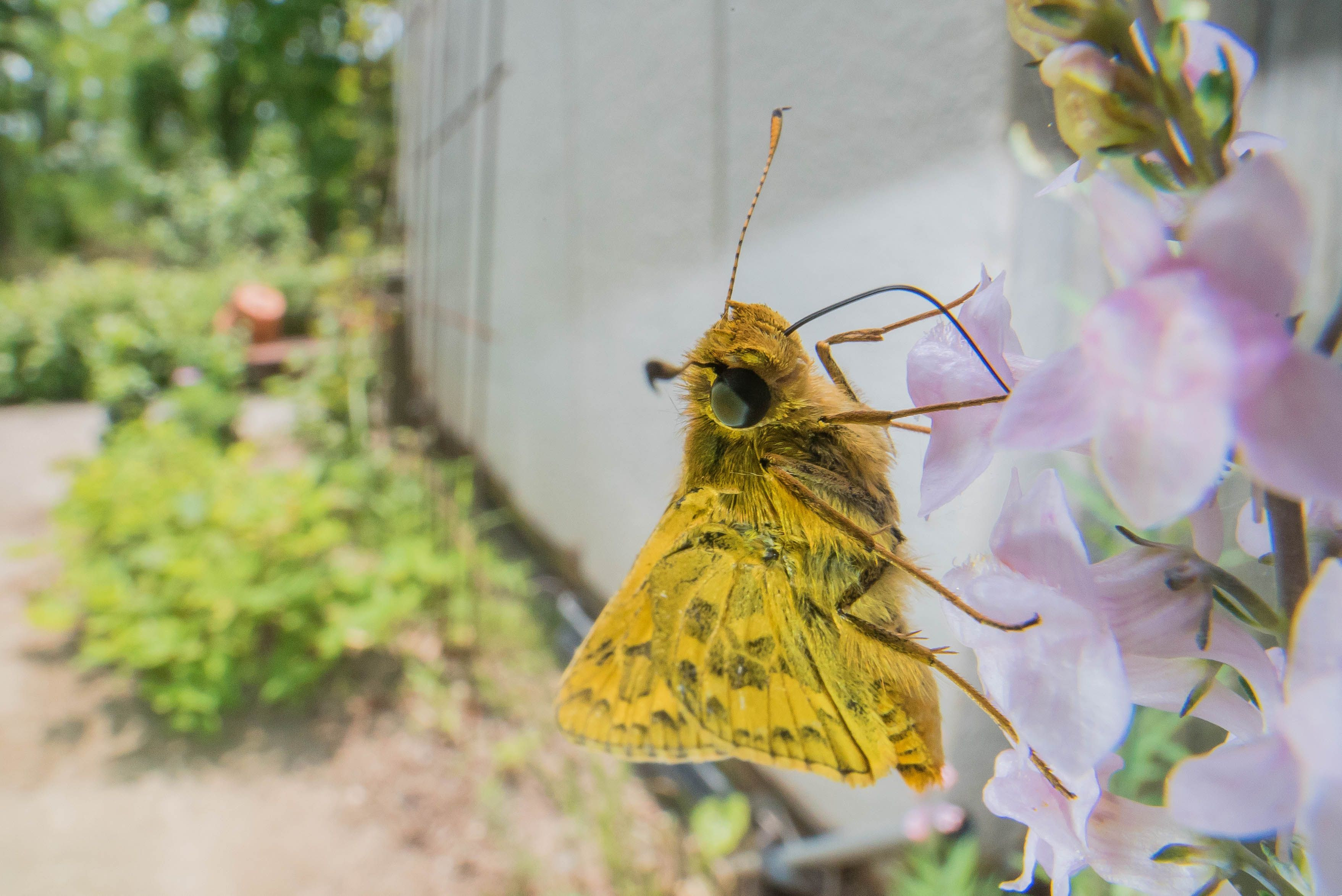キマダラセセリが食事に夢中でレンズが目の前に迫っているのに動じません。