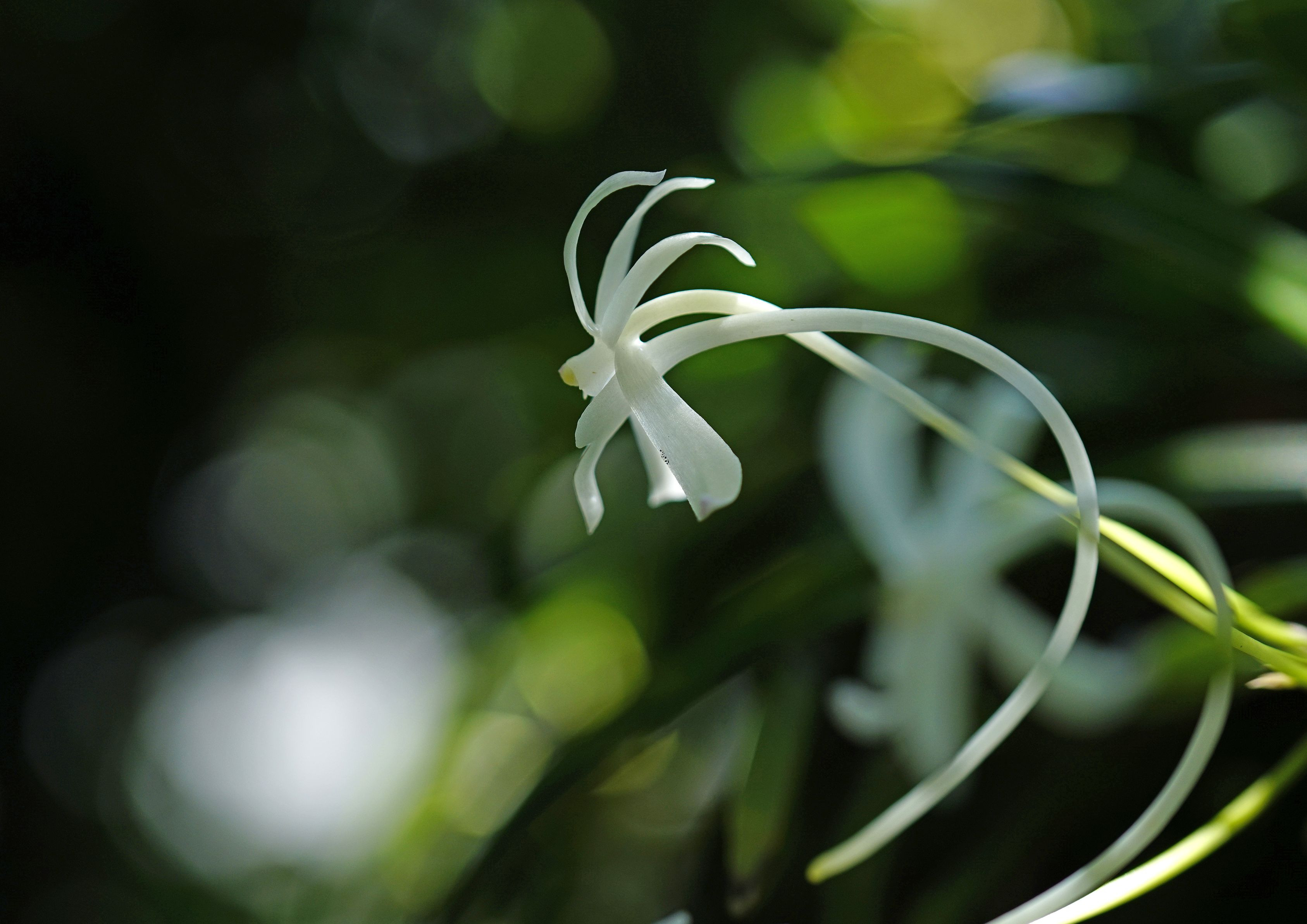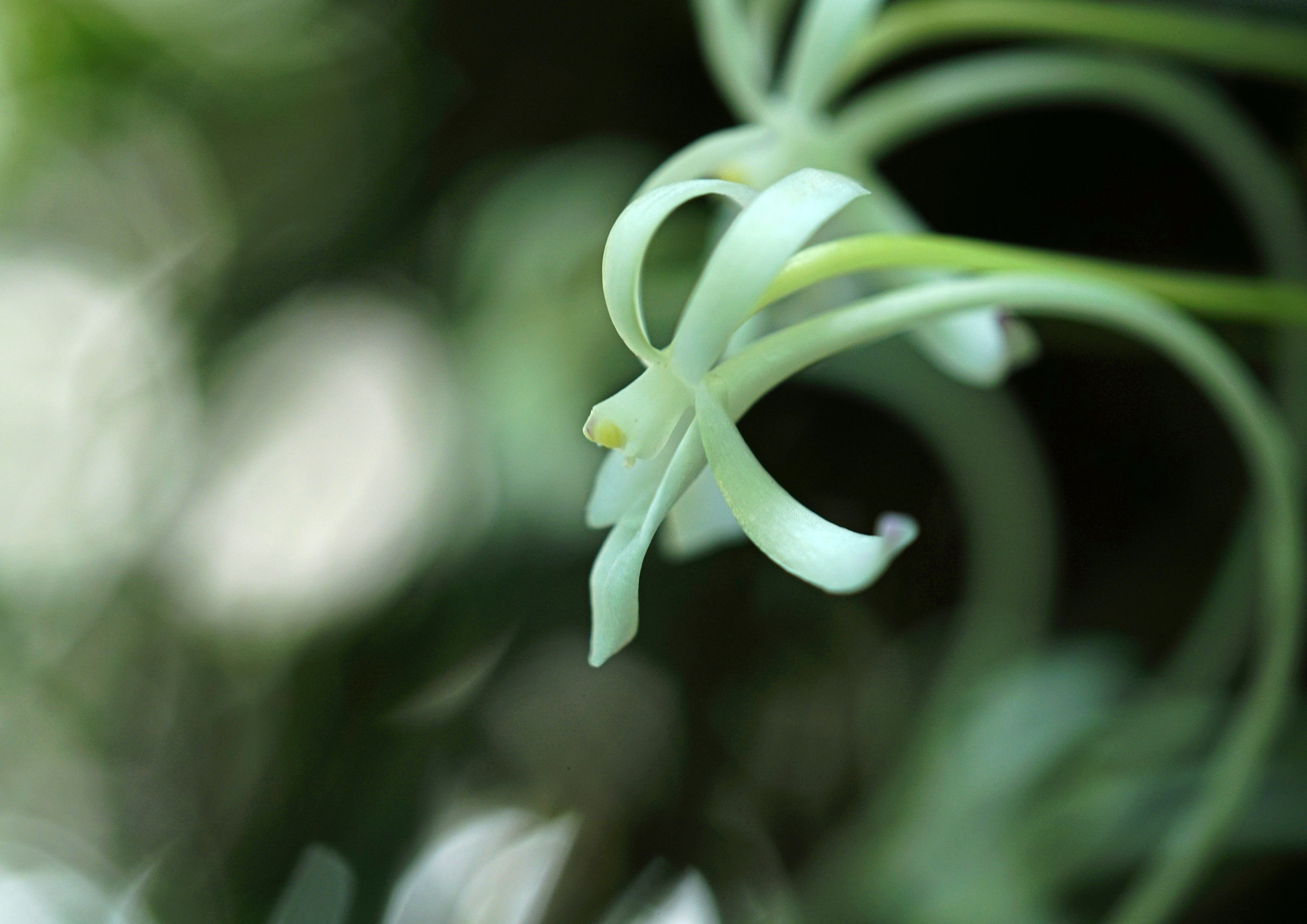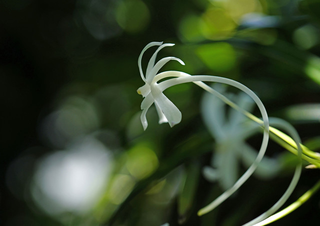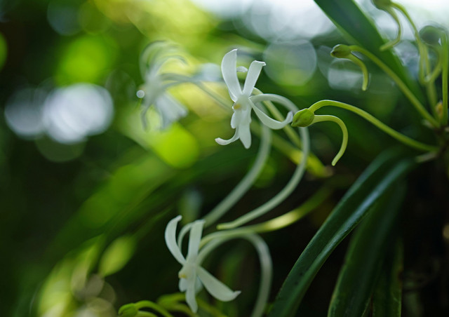 雨上がりに、木の枝にぶら下げてある風蘭の花を撮りました。