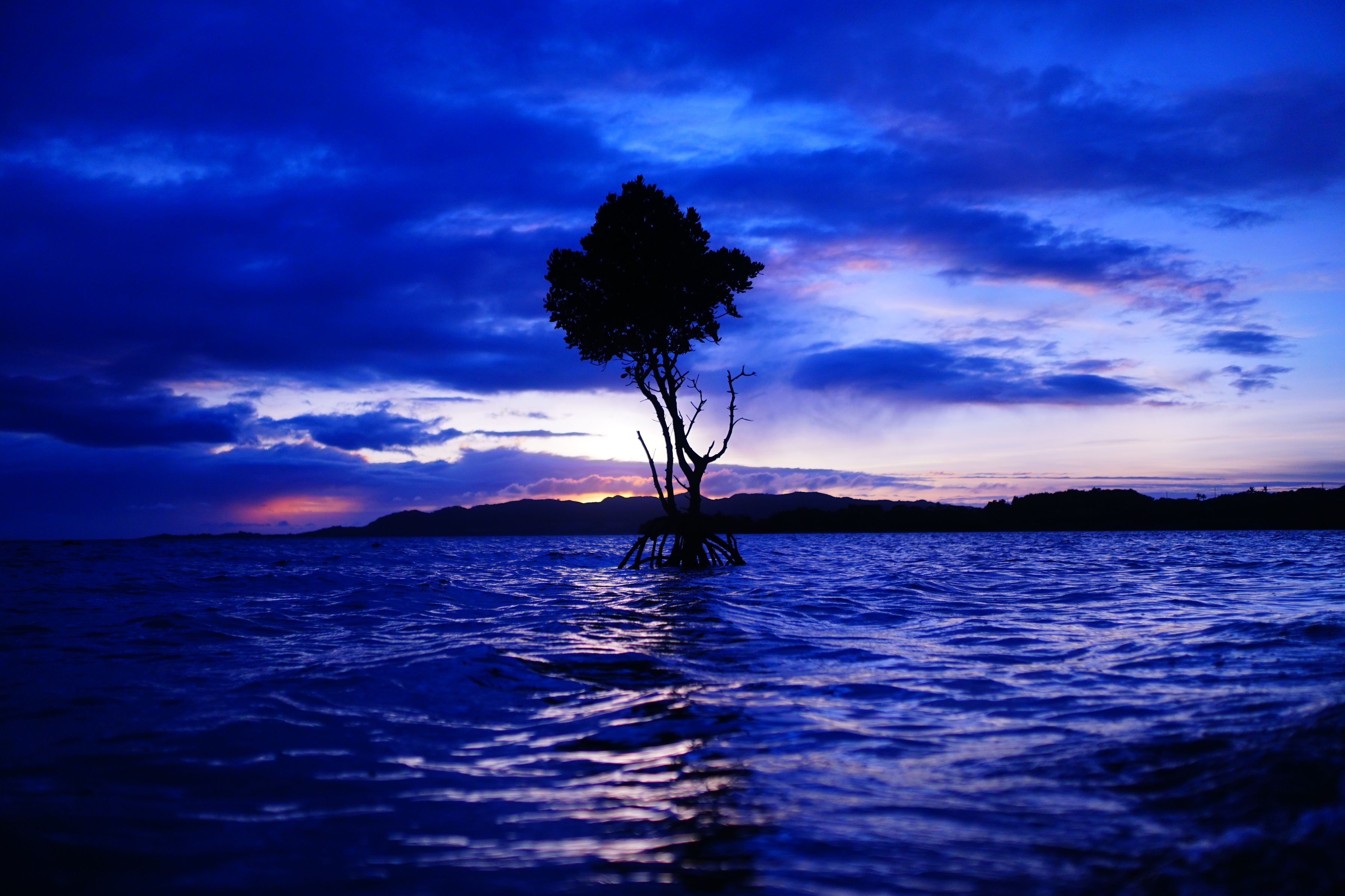 石垣の海に落ちる夕陽と一本のマングローブ。 独創的な雰囲気になりました。