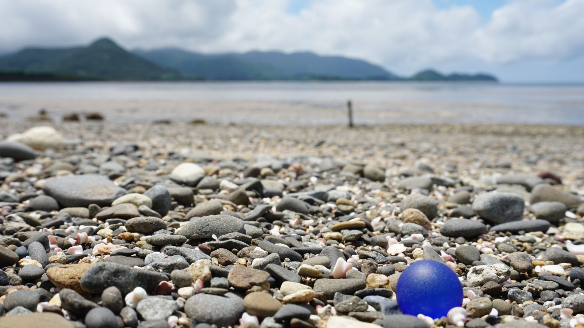 海岸を歩いてると、まるで撮ってくださいと言ってる様な青いガラス玉が…ローアングルで狙ってみました。