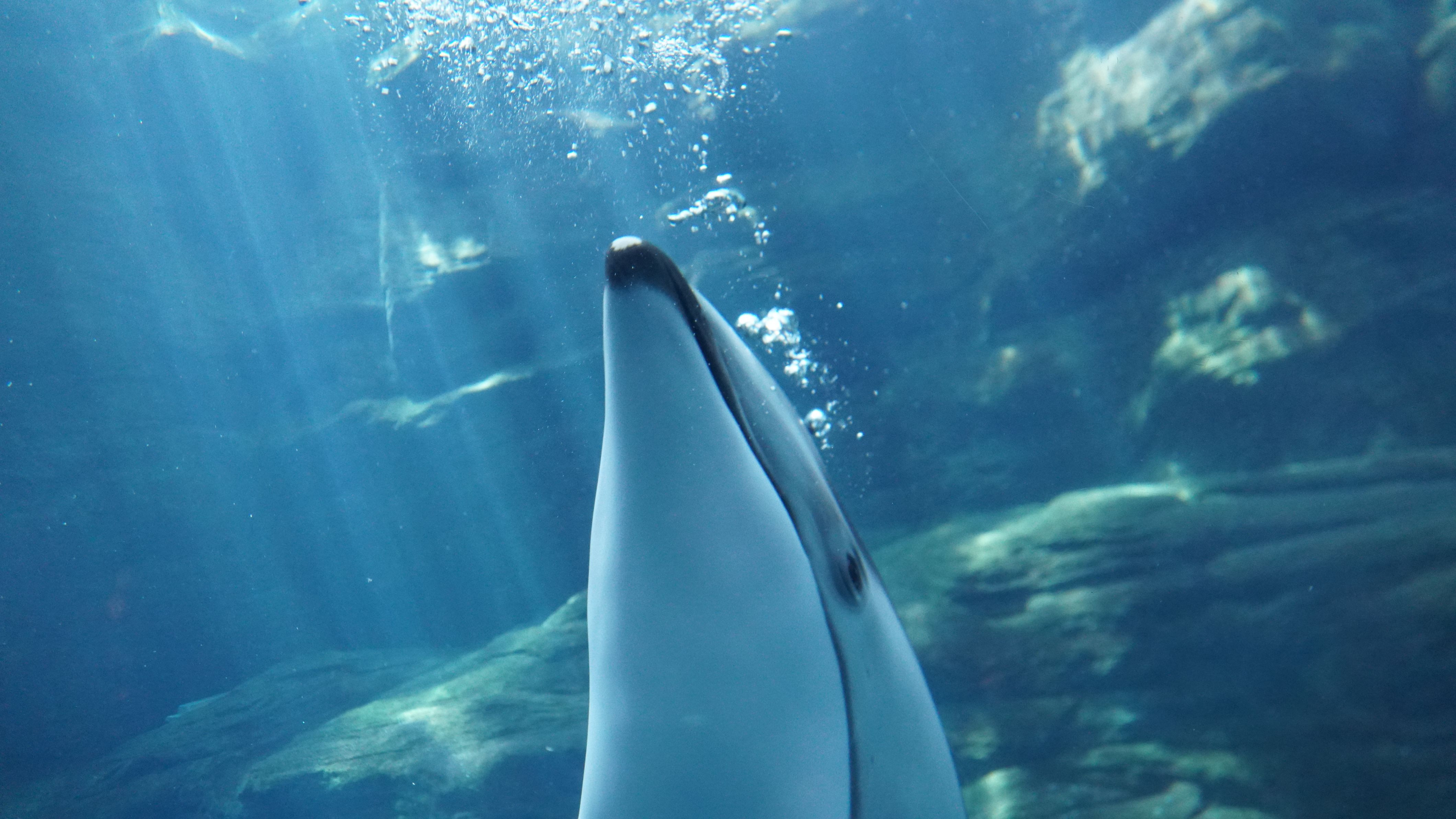 大阪・海遊館にて撮影。 朝一番に誰もいないうちに、カマイルカの水槽に行けば、澄んだ水に朝の光が差し込んで、気持ち良さそうに泳ぐイルカたちを見ることができます。 「アクア」は私の大好きな子です。