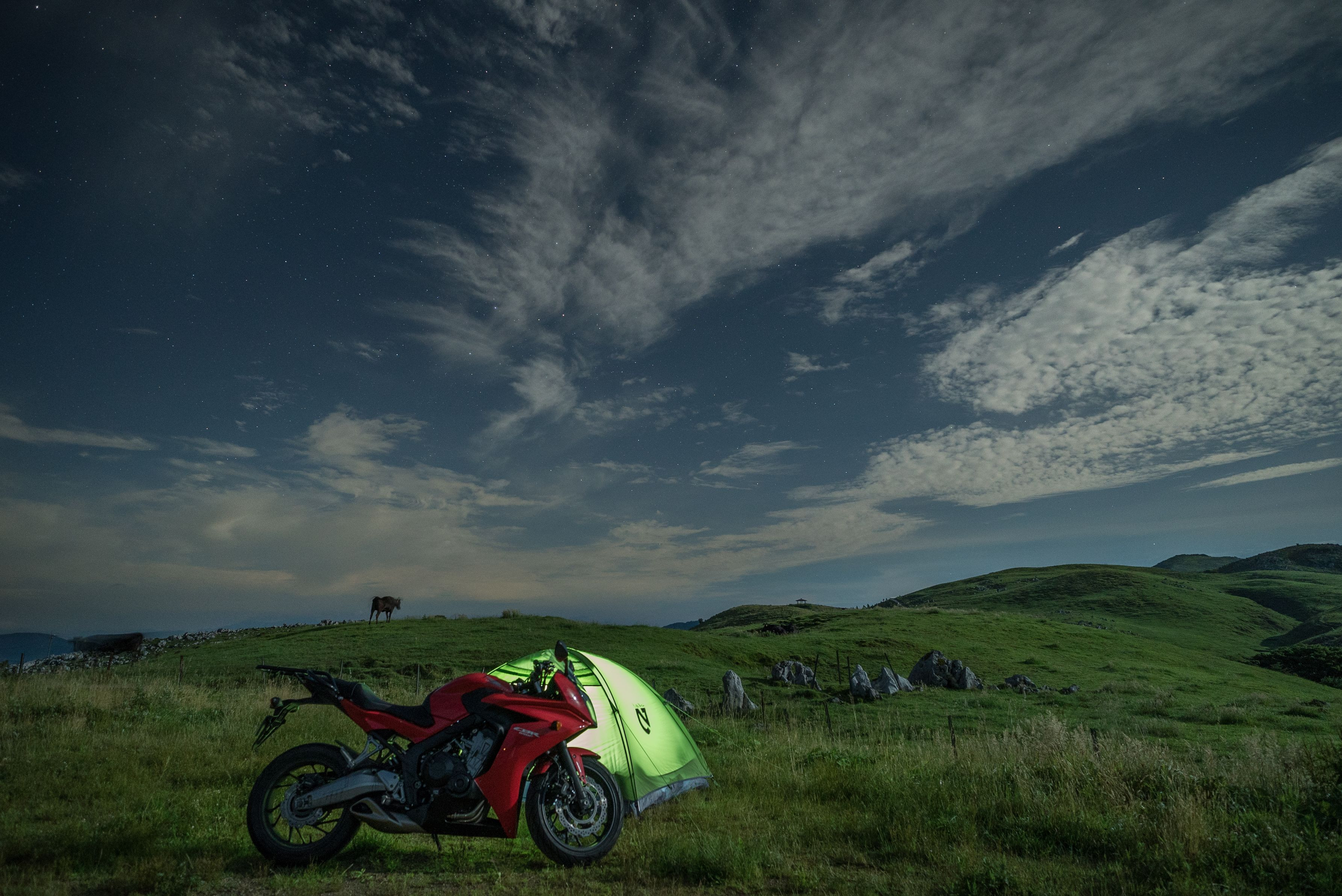 四国へキャンプツーリングに行った際の写真です。 満月期でしたので天の川は良くわかなかったですが、 月の光の下、良い写真が撮れたと思っています。 遠くの牛や、月の光で出来た影が気に入っています。