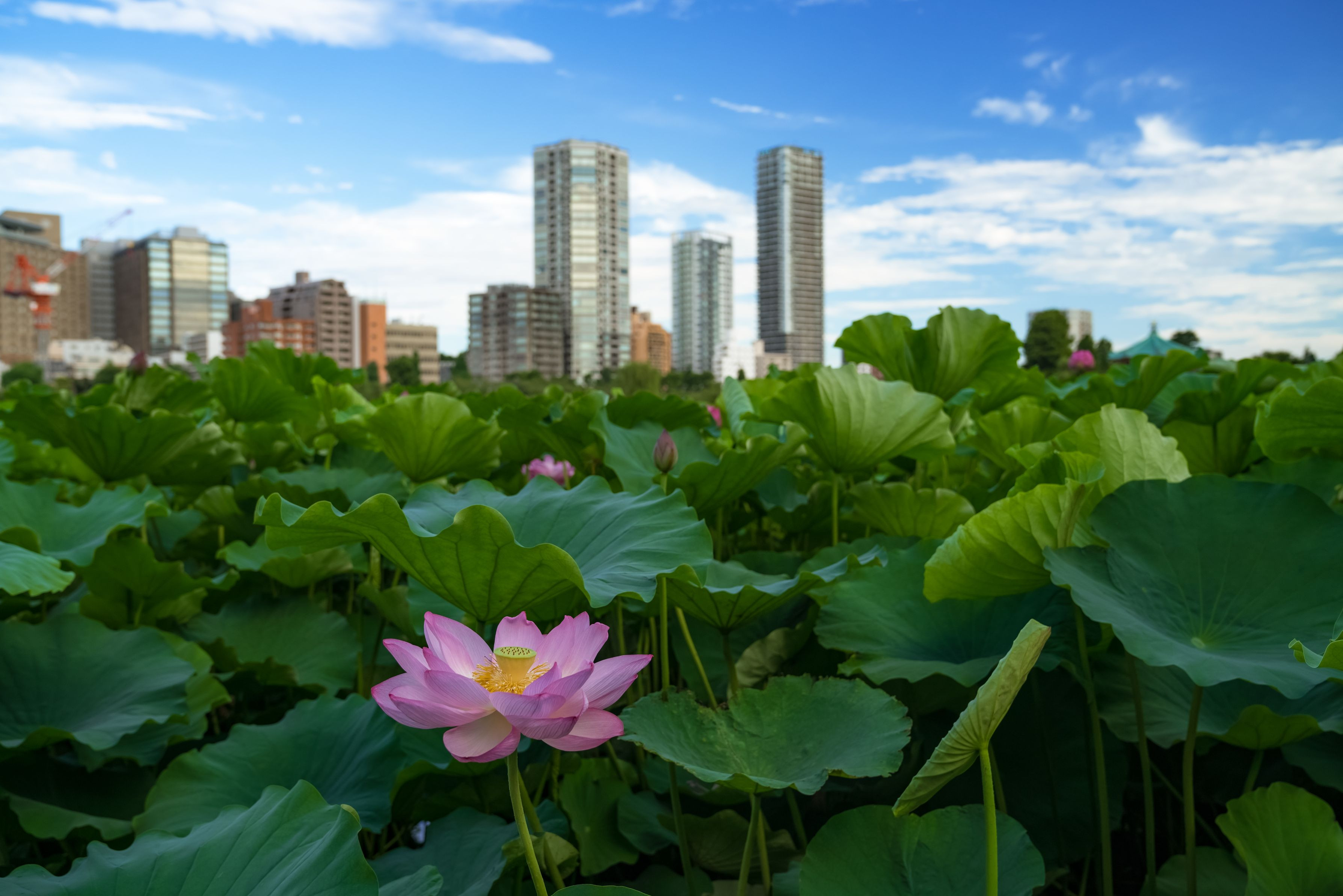 始発電車に乗ってきました。 都会の風景をバックに 「蓮の花」最初の一枚です。 (上野恩賜公園にて)