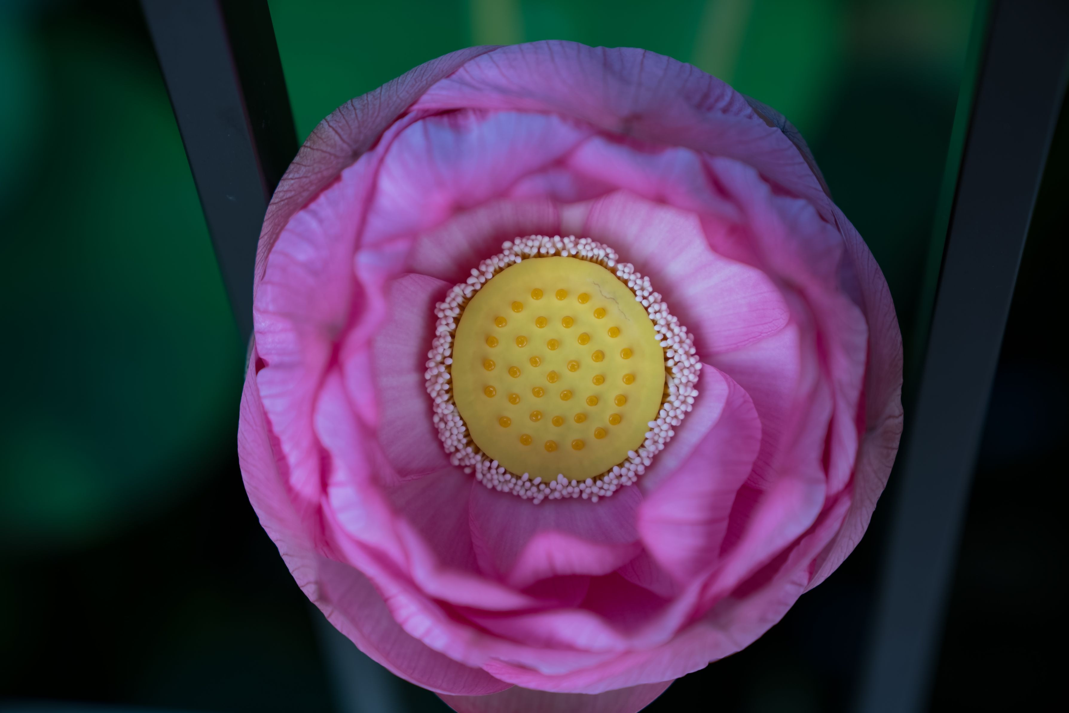 池に浮かぶ遊歩道 その柵から顔を出した蓮の花! 蓮は池に垂直に伸びて花を咲かせます。 なかなか真上からは撮らせません。 この蓮は、人にやさしく真上の姿を撮らせてくれました。