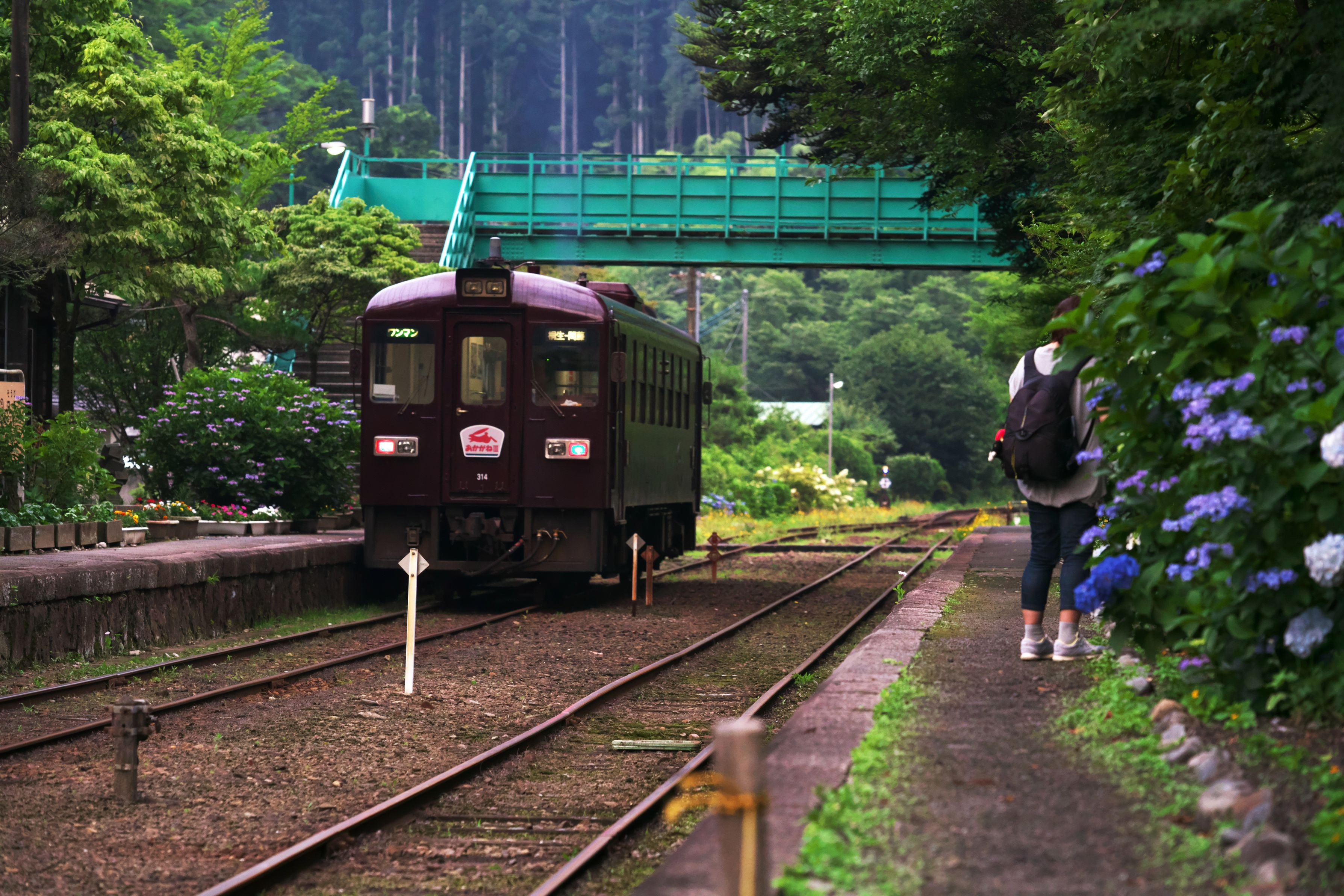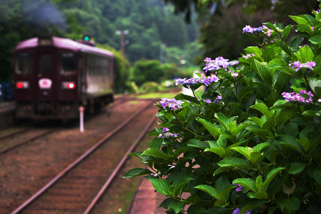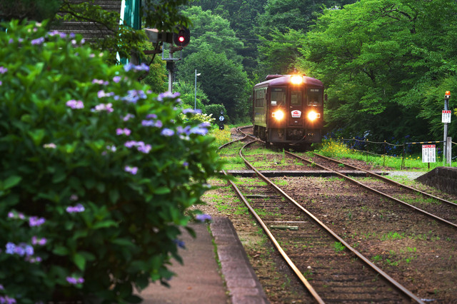 紫陽花の駅を走る
