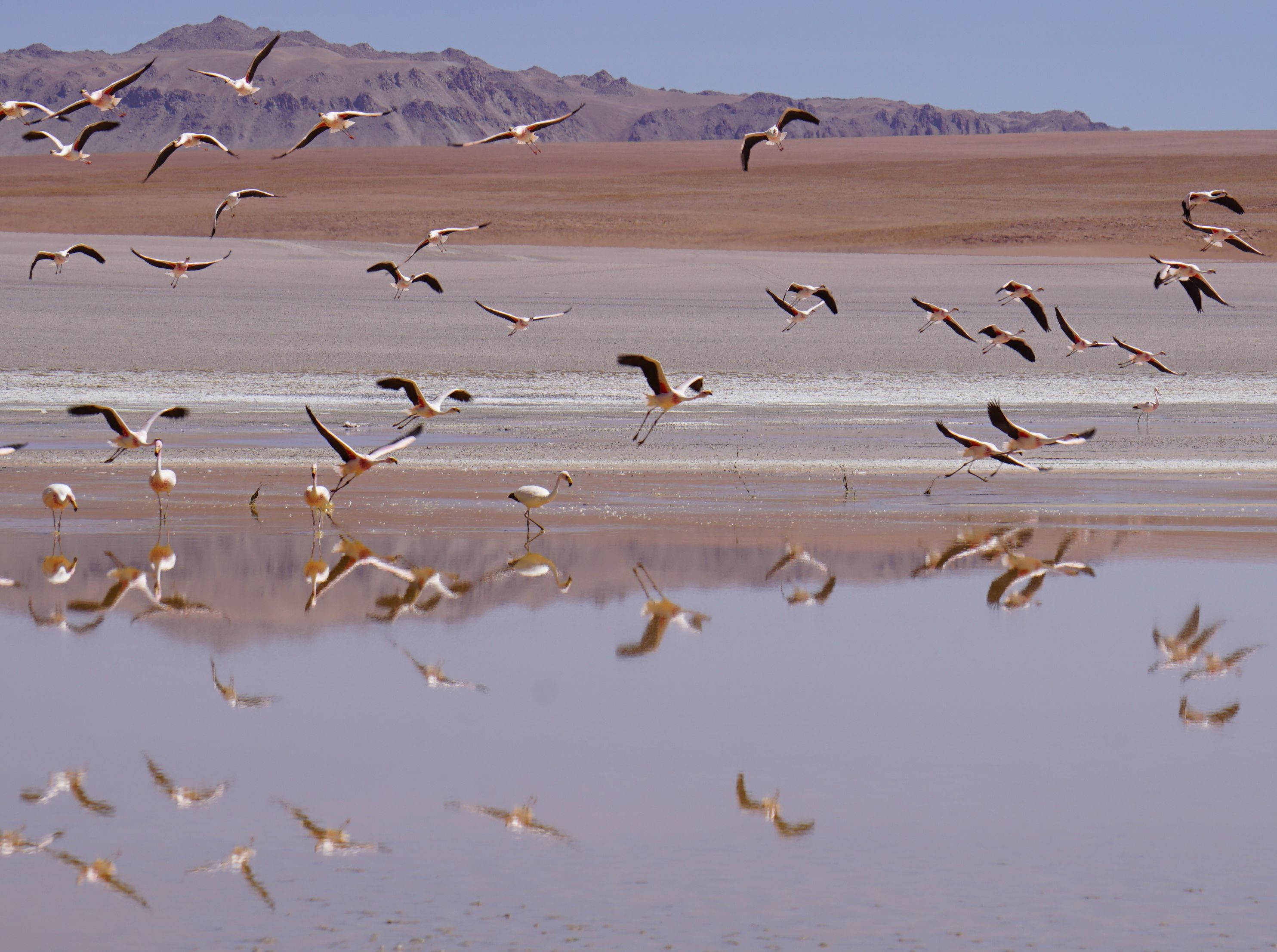 南米ボリビアの海抜4000~5000m高地砂漠に点在する塩湖に群生するフラミンゴ。鏡面の塩湖に映えるフラミンゴの飛翔です。 南米在住のこども家族と旅行した時、孫がフラミンゴを追いかけたので、期せずして一斉飛翔ととなりました。