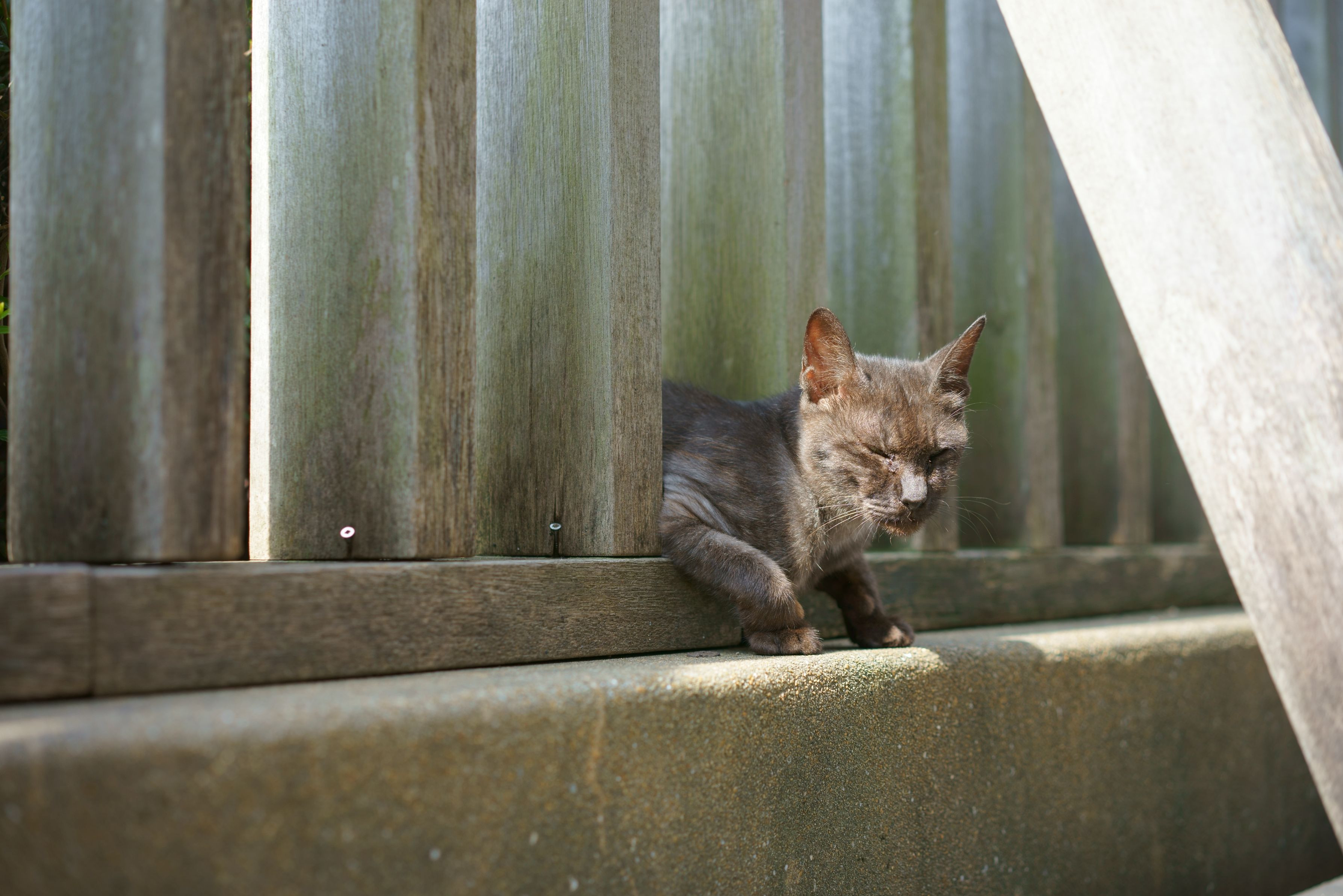 少し怖がりな野良ねこちゃんです。柵の間から顔をだし、うつらうつらしながらも、びくびくしている感じのねこちゃんでした。のんびりとした時間でした。