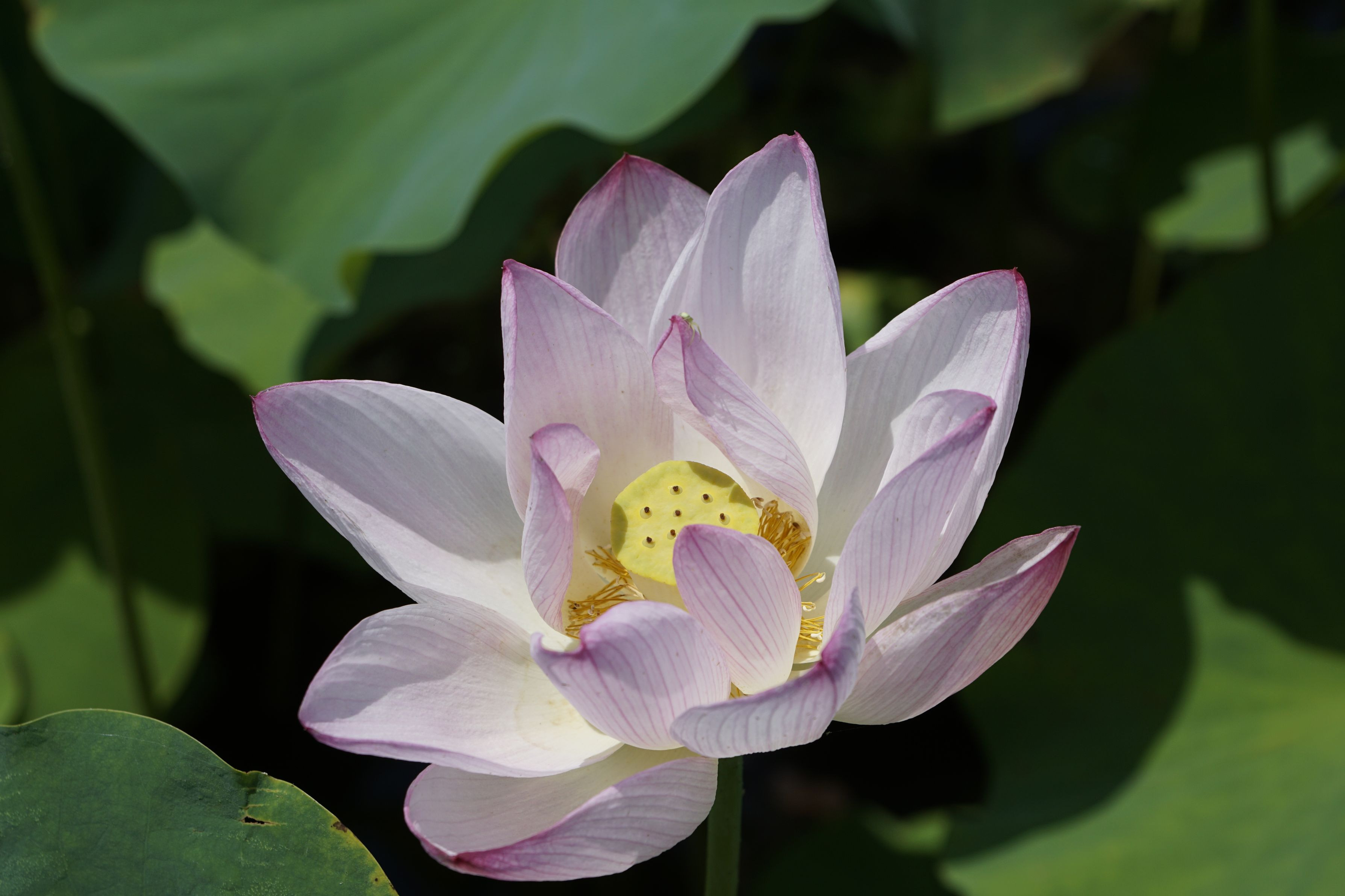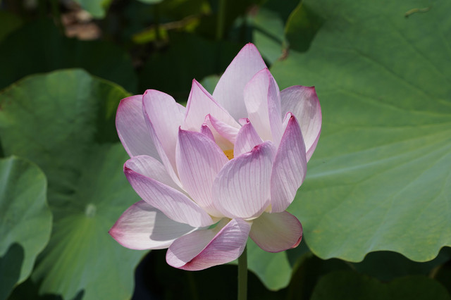 やっと、美しく開花した蓮の花を観ることができました。 真夏の陽光に優しく輝いていました。