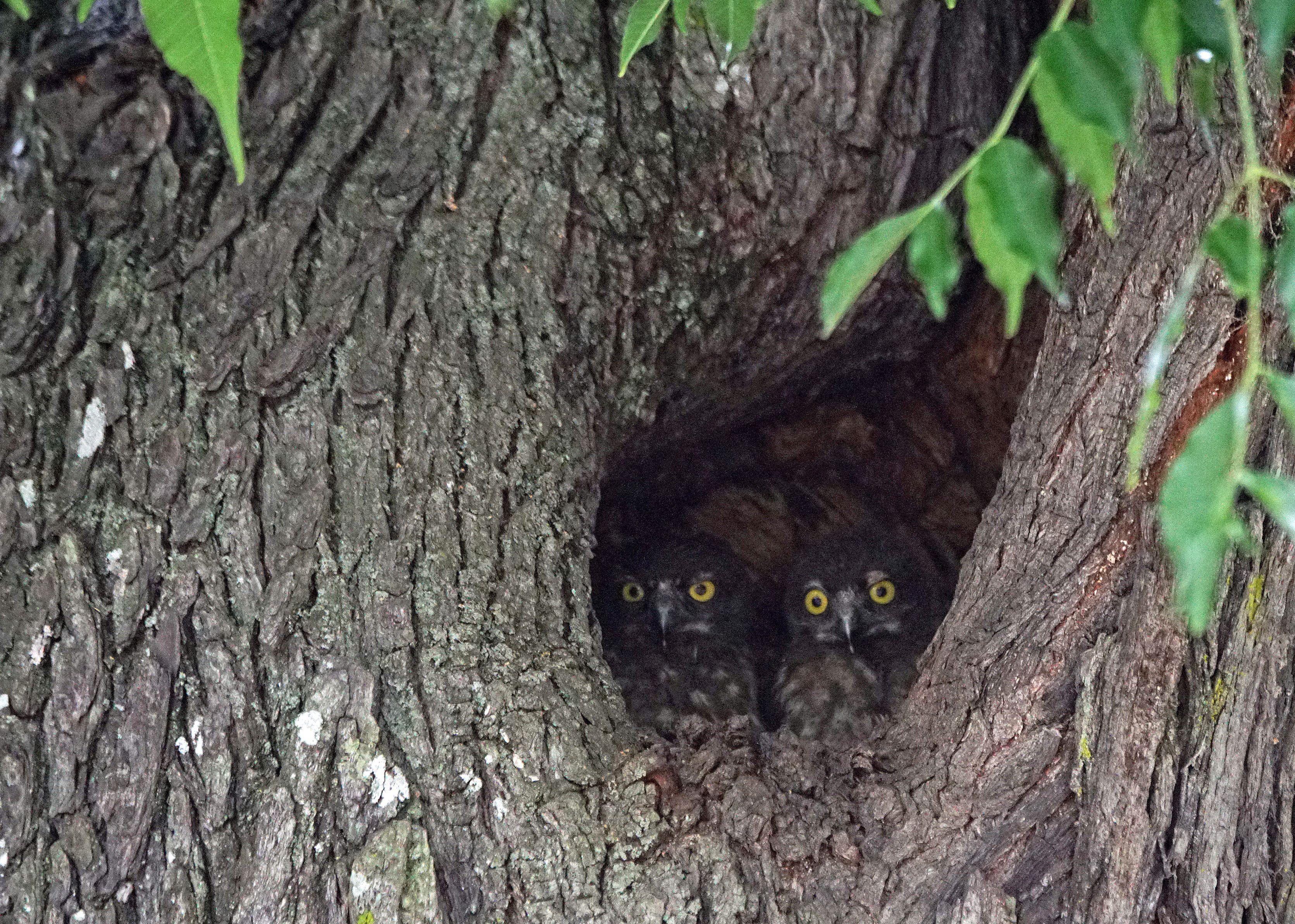 #アオバズク# 地元のお寺に6月の初旬にアオバズクが渡来してほぼ2ケ月に及び繁殖活動。 3羽の雛を育てた。後々の思い出として数コマ残す事とした。 ▶炎天の下、全く予期出来ない栴檀の巣穴からの雛の顔出しを待機。 全身から汗・汗・・・ 遂に2羽の雛が顔出した!!