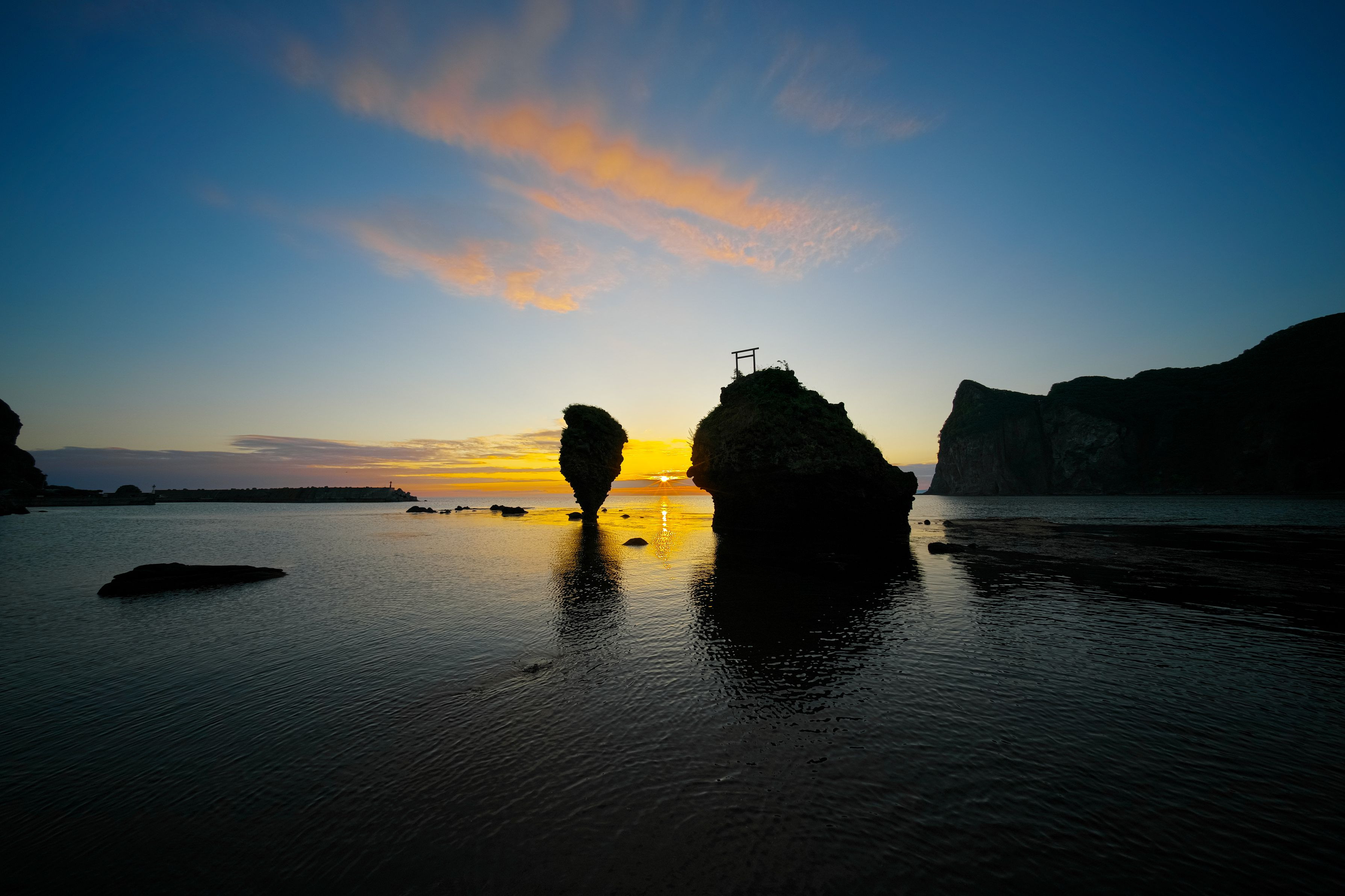 2017/7/29 余市町 α9+Voigtlander HELIAR-HYPER WIDE 10mm F5.6 左からえびす岩、大黒岩、烏帽子岬 朝焼け雲と日の出の光条を添えて。