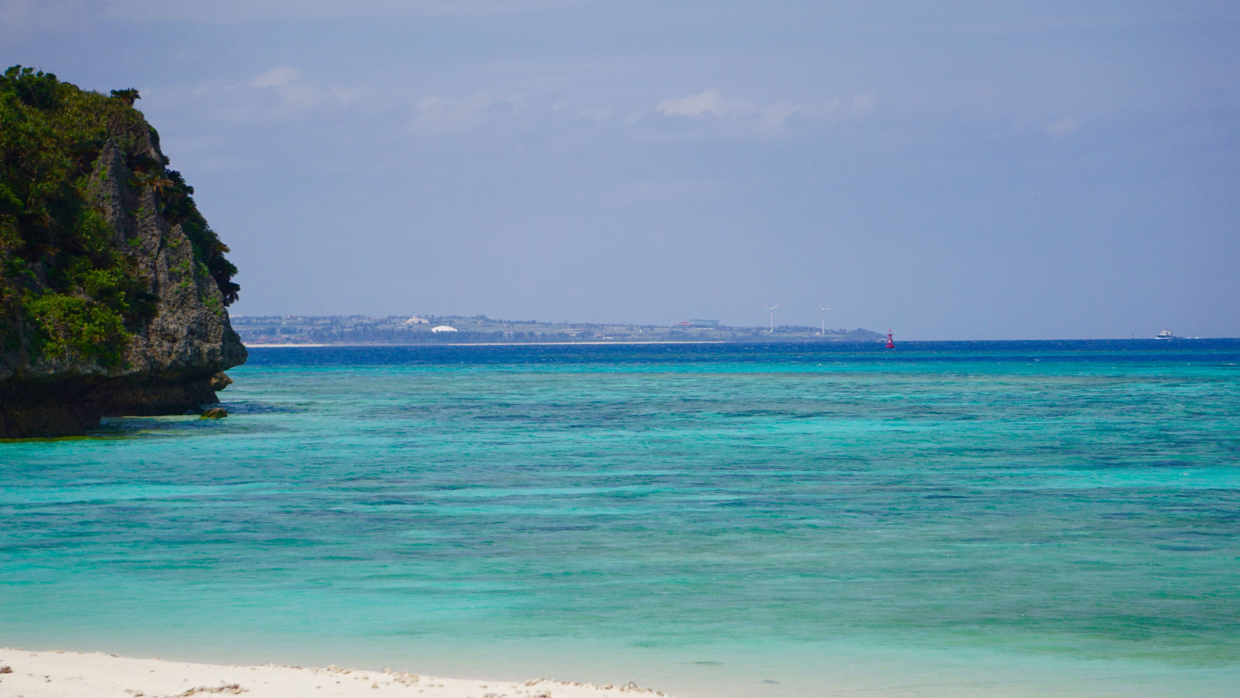 沖縄県瀬底島で撮った写真で奥に見えるのが伊江島です=)