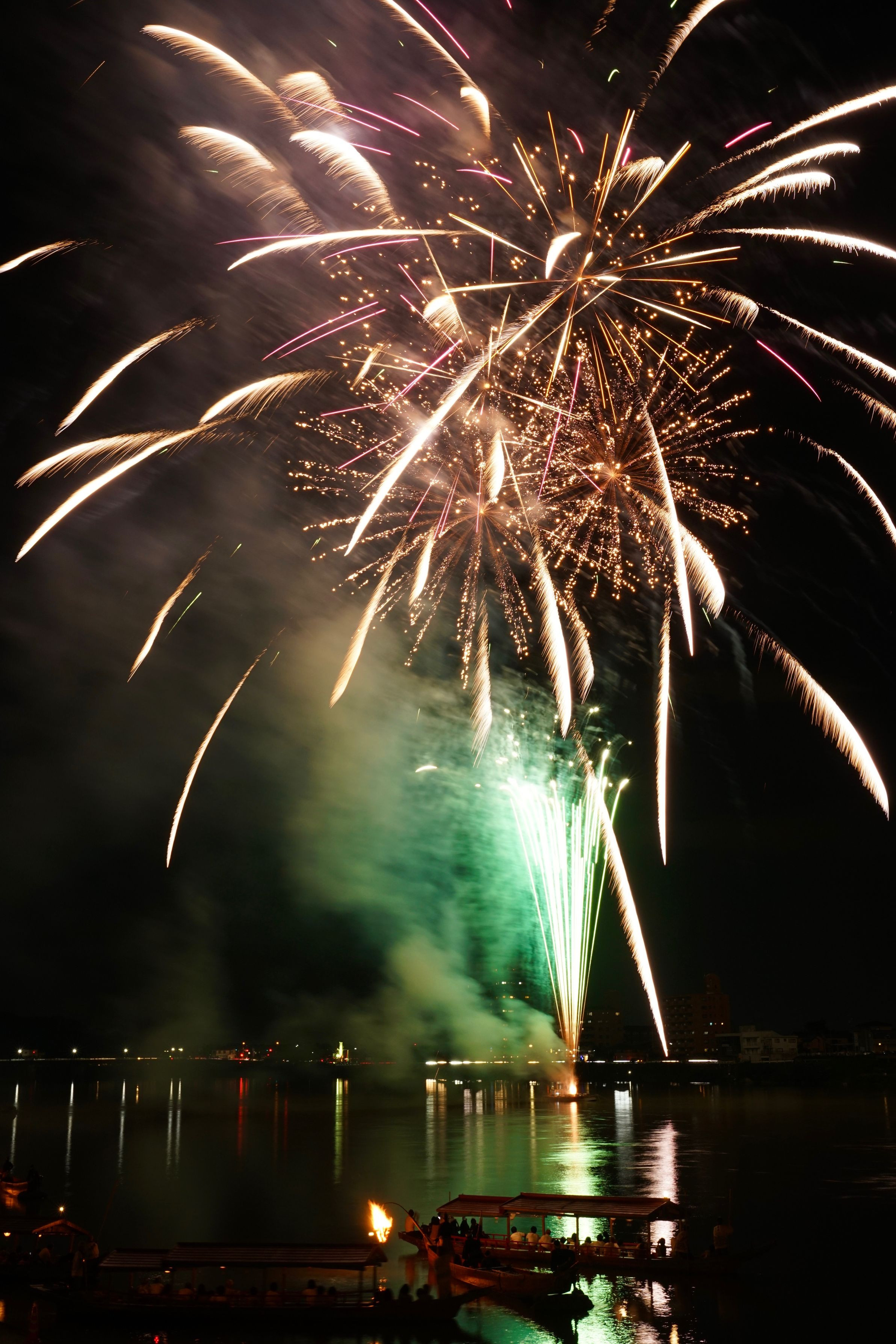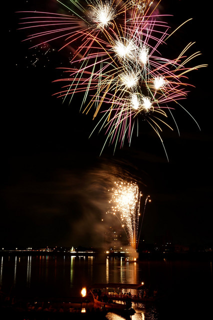 鵜飼舟、屋形舟の位置や花火の種類が毎回違うので思うように撮れません。