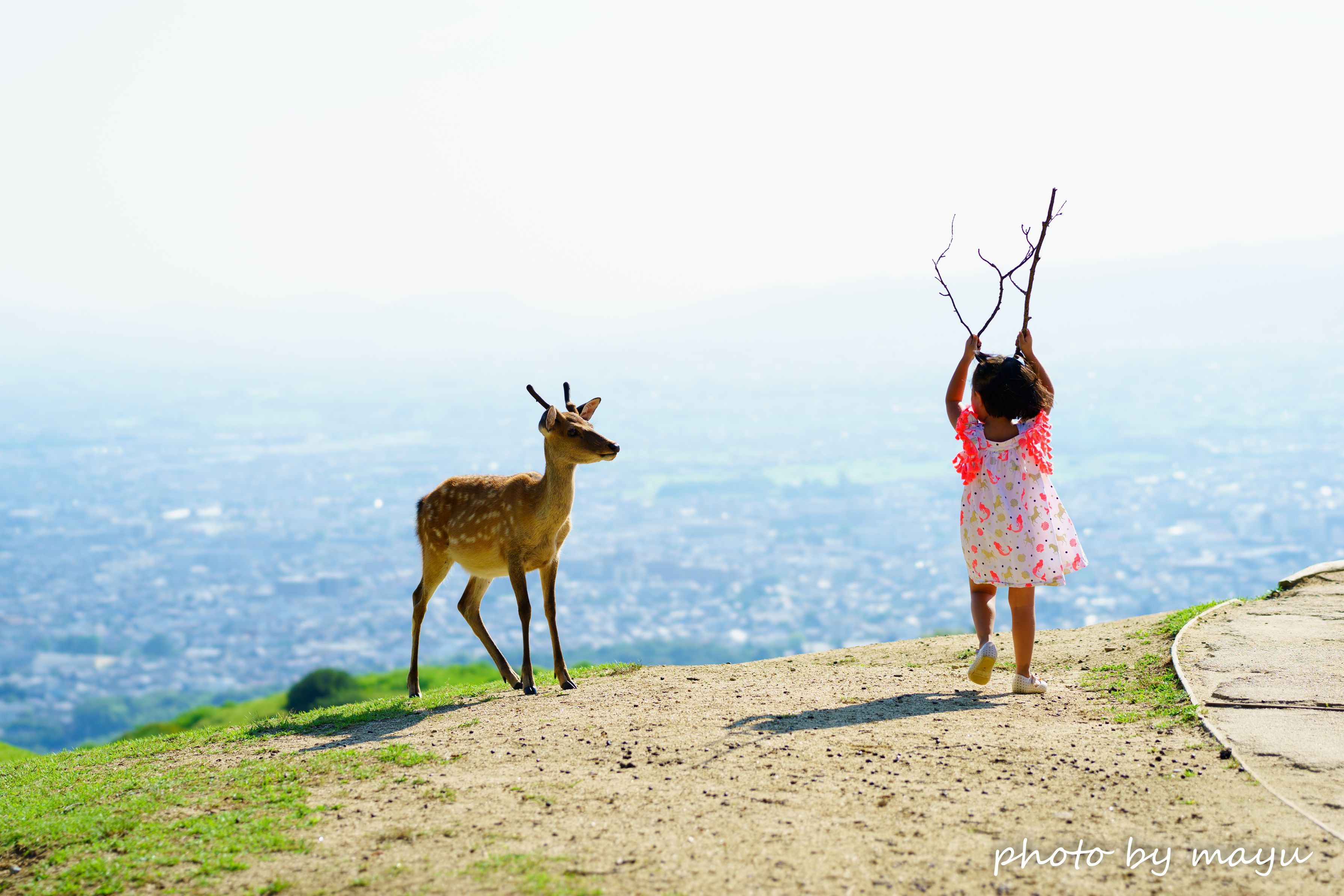 角が生えはじめた男の子と海外の女の子との一瞬。 この後、男の子鹿は女の子の急な動きにビックリして 走って逃げて退散。 その後はトラウマになったのか 女の子が近寄ると逃げていました(笑) 「はじめまして~。 お、おともだちに… なぁる?」 と会話が聞こえてきそうでした♡