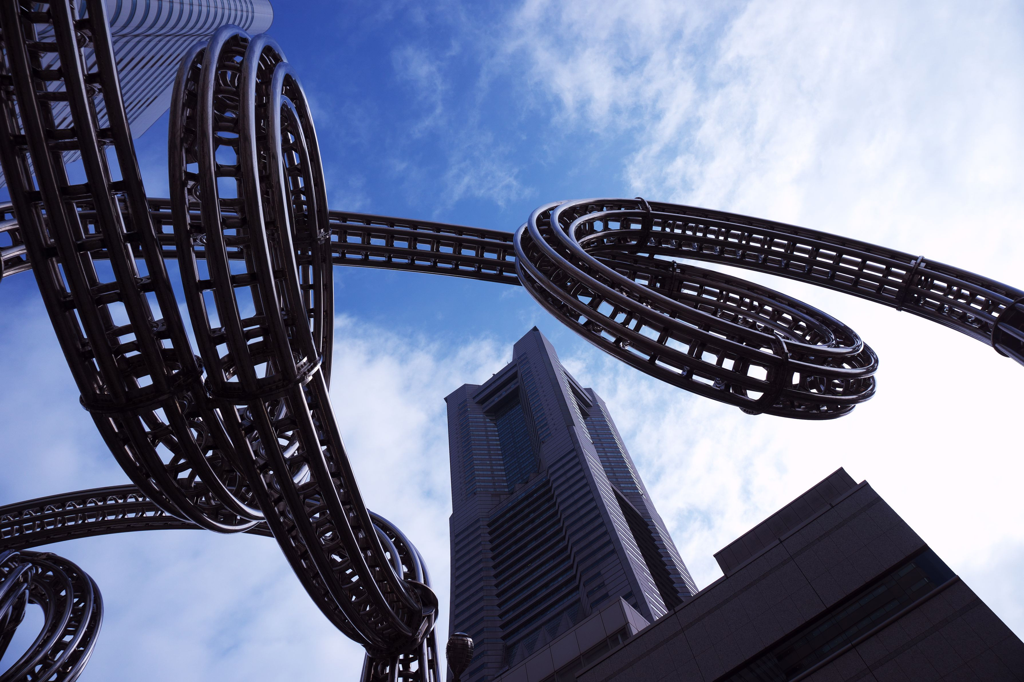 『モクモク ワクワク ヨコハマ ヨーヨー 』と言う、ジェットコースターのレールのようなオブジェを下から撮影しました。