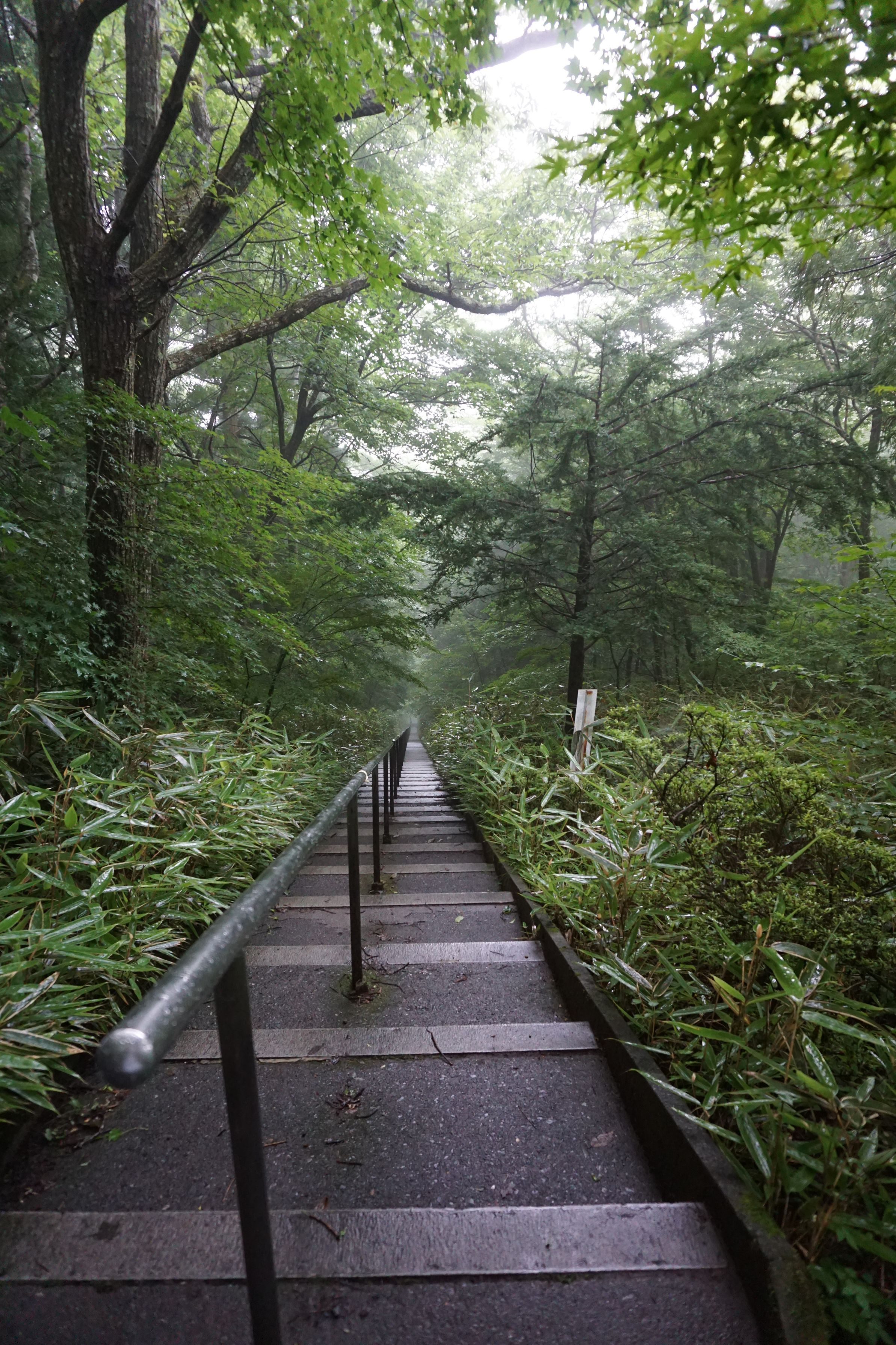 富士山の麓のある神社。霧で先が見えない、どこまでも続く階段です。