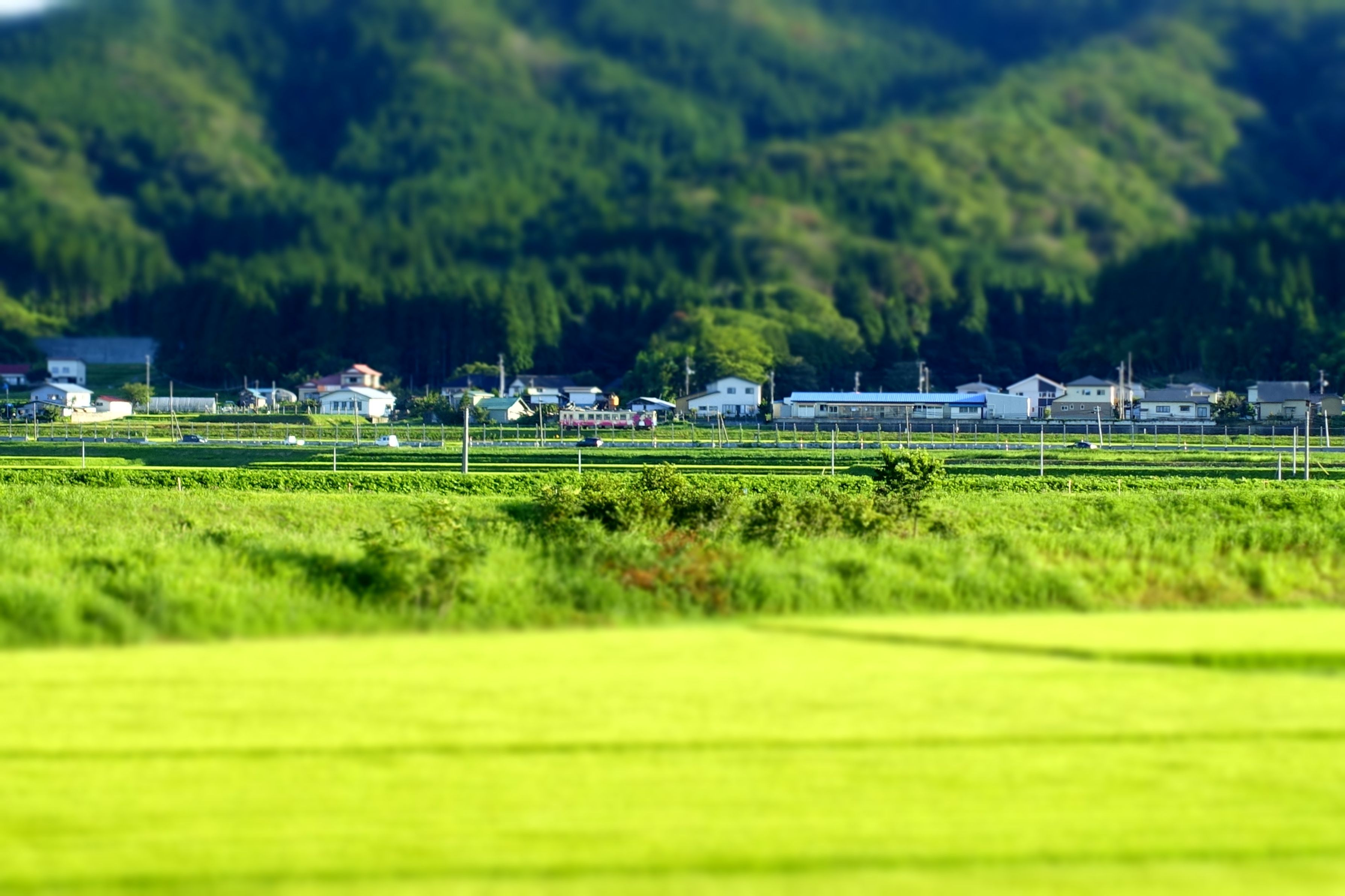 のどかな田園風景を走る 「おばこ号」 ミニチュアエフェクトです。